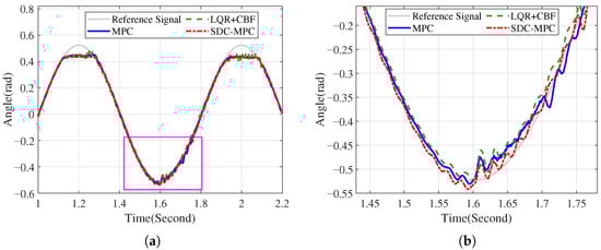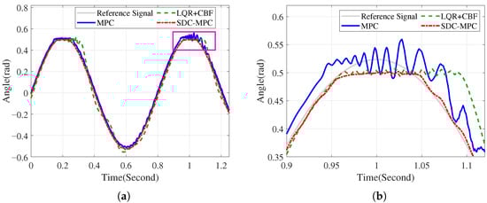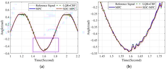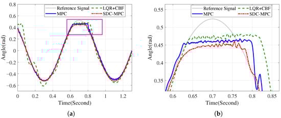 Experiment 1 (angle constraint 0.5 rad). As a baseline, LQR designs a linear state-feedback for a linearized model and is paired with a CBF to enforce safety [12]. SDC-MPC achieves the smallest tracking error while strictly respecting the safety band. Quantitatively, Table 1 presents a comprehensive statistical analysis. In terms of safety, the maximum absolute error (MAE) is 0.051 rad for SDC-MPC, significantly lower than 0.151 rad for MPC and 0.300 rad for LQR + CBF. Moreover, SDC-MPC achieves the lowest root mean square error (RMSE) of 0.019 rad and integral absolute error (IAE) of 0.032 rad·s, indicating that it maintains the highest average tracking precision and minimal cumulative deviation throughout the task. The zoomed view shows visibly smaller excursions near the boundary for SDC-MPC, indicating tighter safety enforcement.