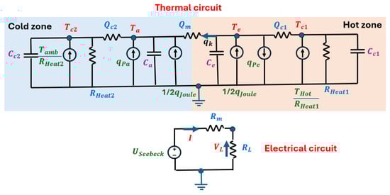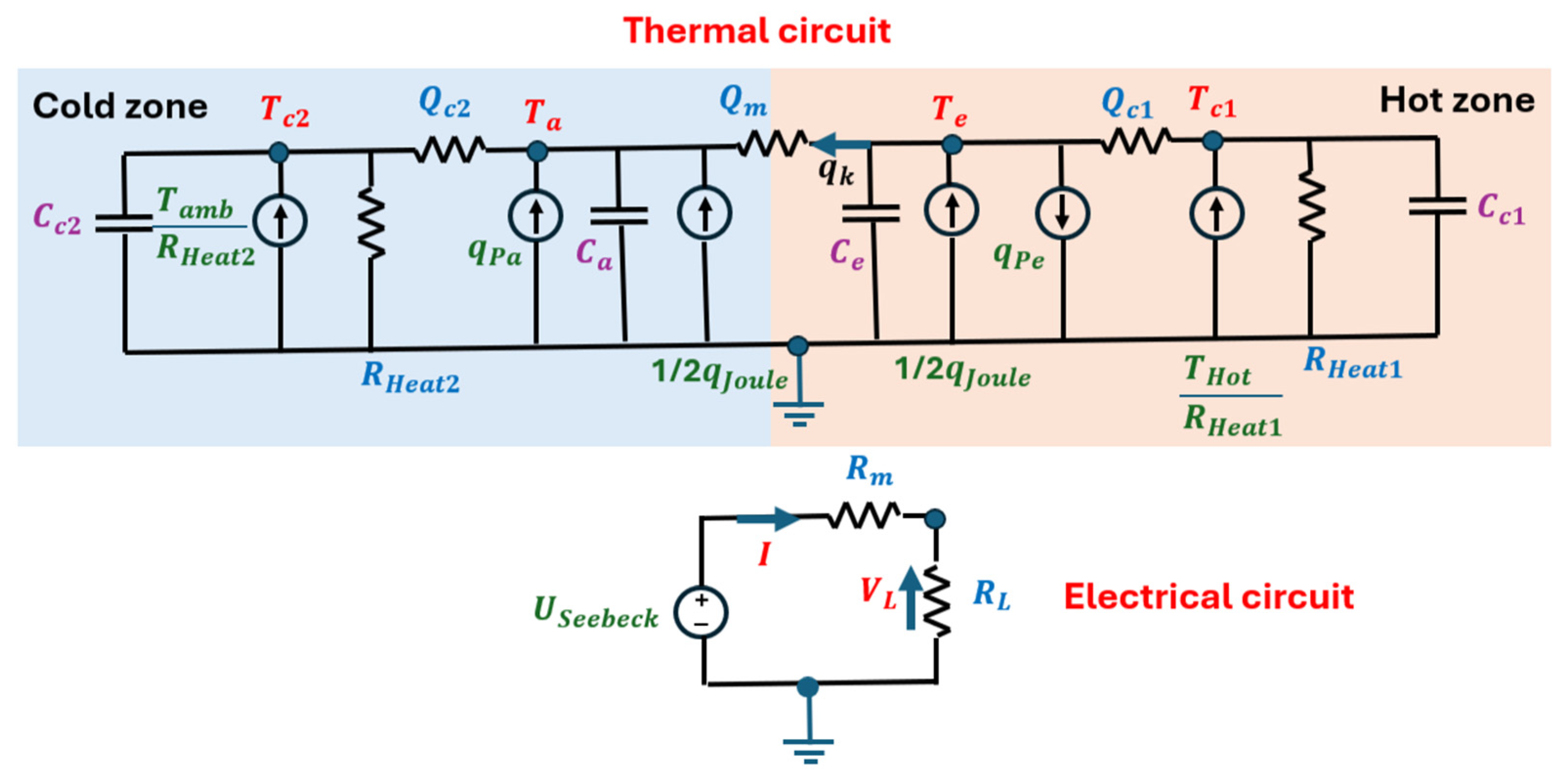 The complete system of nonlinear differential equations of the transient thermal and electrical circuit that describe the dynamics of the TEG is expressed by Equations (13)–(16):