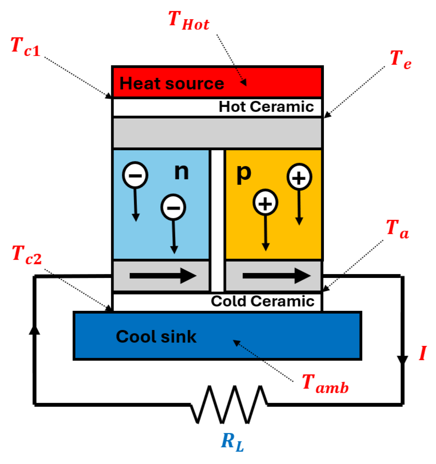 Figure 1 presents a simplified scheme of a TEG, showing its essential elements: heat source, heat sink, n-type and p-type semiconductors, structural heat-conducting ceramics, and the electric charge