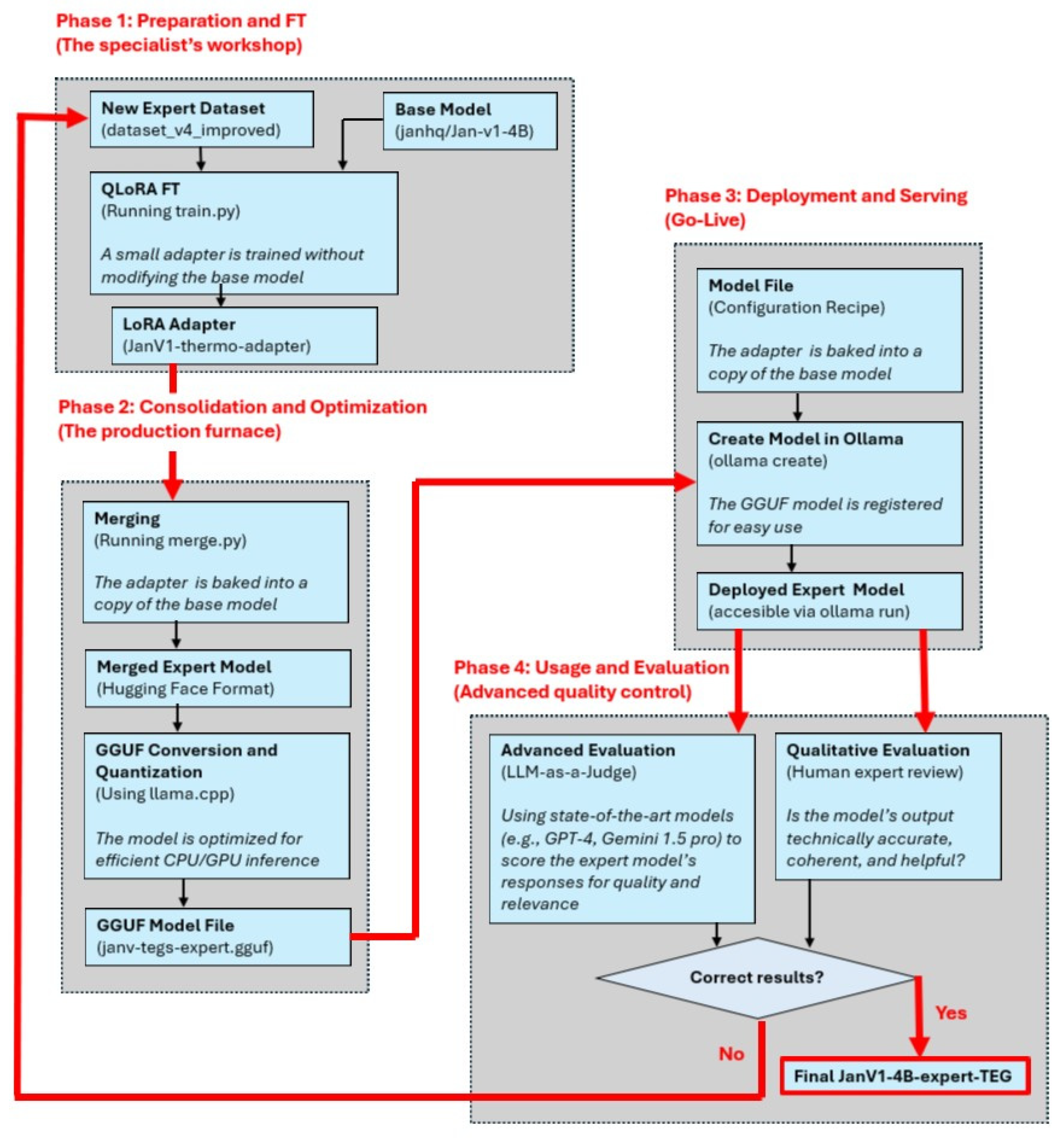 In summary, the novelty of this research lies in four main contributions that advance the state of the art in applying LLMs to specialized engineering. First, a comprehensive and fully reproducible methodology is presented, encompassing everything from data curation to local deployment, to transform the general-purpose JanV1-4B LLM into a specialized assistant within the TEG engineering domain. Second, a strategic design for a training dataset is proposed that balances the injection of deep knowledge—the conceptual ‘what’—with the training of behavior and responsiveness—the procedural ‘how’—which is essential to mitigate catastrophic forgetting and ensure robust performance. Third, a rigorous, multi-level assessment framework is introduced, designed to measure advanced cognitive skills, such as critical reasoning and self-correction, transcending traditional performance metrics. And fourth, the feasibility of achieving this high level of specialization on local hardware is empirically demonstrated, validating the QLoRA approach as an effective way to democratize the development of AI specialized in the TEG sector.