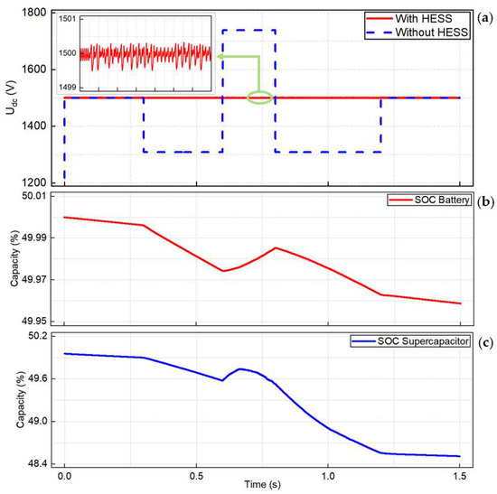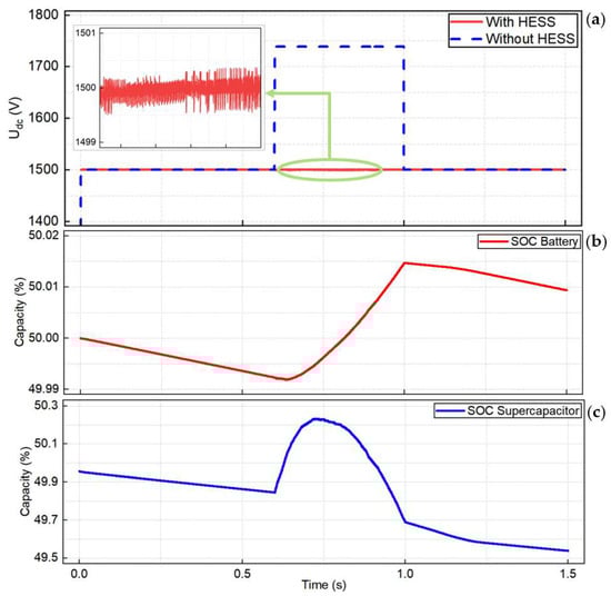 Under the multiple acceleration-braking conditions within a short period, the metro underwent continuous acceleration and braking in very short intervals, resulting in oscillations in power demand, which posed more challenges to the DC bus, as shown in Figure 8a. Simulation results indicated that after configuring the proposed HESS, the voltage was confined between 1499.5 and 1500.3 V (shown in the zoom-in part of Figure 8a), with a fluctuation amplitude of 0.05%. This demonstrated that the hybrid energy storage system could rapidly respond to frequent acceleration-braking switching and maintain voltage stability, exhibiting energy coordination capabilities under complex conditions. The HESS could effectively mitigate the impact of multiple power fluctuations on bus voltage, and support the safe operation of the system under frequent acceleration-braking conditions.