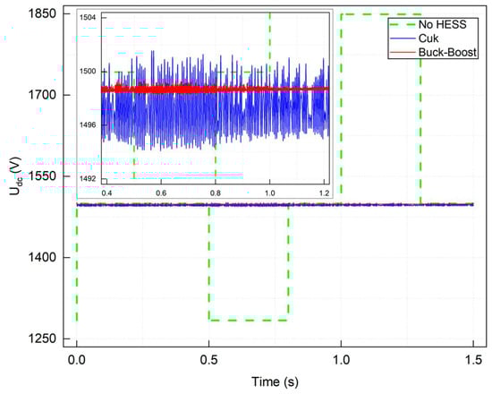 The simulation conditions were set. From 0 s to 0.5 s, the metro was in constant-speed operation. From 0.5 s to 0.8 s, the metro was accelerating. From 0.8 s to 1 s, the metro was in constant-speed operation. From 1 s to 1.3 s, the metro was braking. After 1.3 s, the metro re-entered the constant-speed operation. Figure 11 shows fluctuations in DC bus voltage with the proposed battery-supercapacitor HESS applied to a Cuk DC/DC converter topology, compared with a typical Buck-Boost DC/DC converter topology. For the case of the Cuk DC/DC converter topology, the maximum fluctuation was around 7 V, while for the case of the Buck-Boost DC/DC converter topology, the maximum fluctuation was around 0.8 V. It was apparent that the Buck-Boost DC/DC converter topology demonstrated better stability than the Cuk DC/DC converter topology, exhibiting smaller fluctuations and closer alignment with the bus voltage of 1500 V. In summary, the proposed battery-supercapacitor HESS with both topologies effectively maintained voltage stabilisation. However, the Buck-Boost DC/DC converter topology had superior performance.