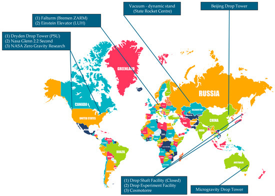 Worldwide, several ground-based facilities for reduced-gravity research have been realized [54,89,90,91,92,93]. The global distribution of large facilities is shown in Figure 1.