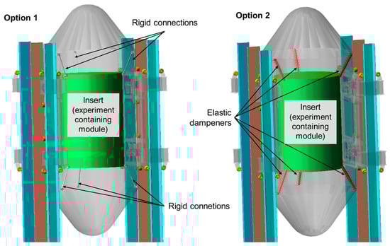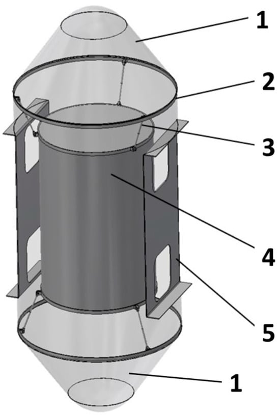The capsule (Figure 5) has been designed in the form of a cylinder (1) ended on both sides with conical covers. Such a shape should ensure low resistance during the capsule’s fall. Composite materials are taken into account for construction to reduce overall mass while maintaining structural integrity. Inside the capsule, there is a research chamber (2), which is isolated from the capsule housing by damping connectors (3). These connectors, positioned at both ends of the chamber, are mounted to reinforcing rims (4) integrated into the cylindrical body. The damping parameters will be optimized through numerical analysis to achieve the desired vibration isolation characteristics.