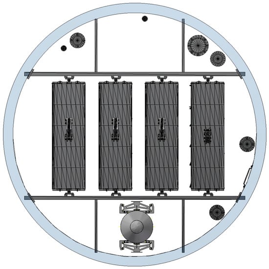 In the cross-section, there is the arrangement of four parallel damping elements or shock absorbers. They are positioned symmetrically along the capsule’s length. These damping connectors are distributed around the research chamber’s circumference, forming part of the six-point suspension system that isolates the experimental payload from vibrations and mechanical disturbances generated during motion.