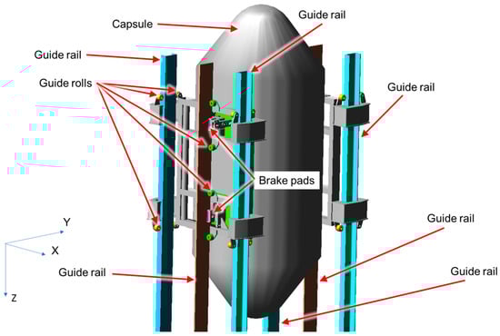 The load-bearing structure of the capsule has been simplified to consist of four fixed rails (Rails 1–4) and two flat bars, which—in addition to controlling the track of motion—serve to brake the set using four pairs of brake blocks. The computational model is composed of the following components, as shown in Figure 7:
