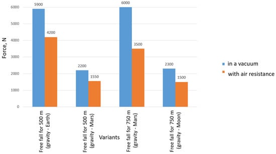The force required to stop the falling capsule was also estimated. It was assumed that the fall distance and braking distance would not exceed 900 m. The braking force values for each variant are shown in Figure 9.