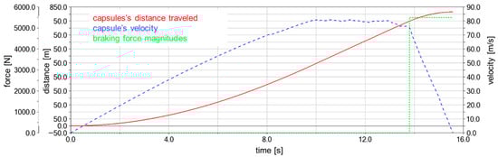 The capsule propulsion system should provide the capability to achieve and maintain the specific accelerations and resulting velocities, as indicated above. The braking system should provide the ability to stop the capsule on a designated track section, taking into account the velocities obtained at the start of the braking process. The assumed mass of the capsule is 350 kg, so the kinetic energy will reach a maximum value of approximately 1.7 MJ.