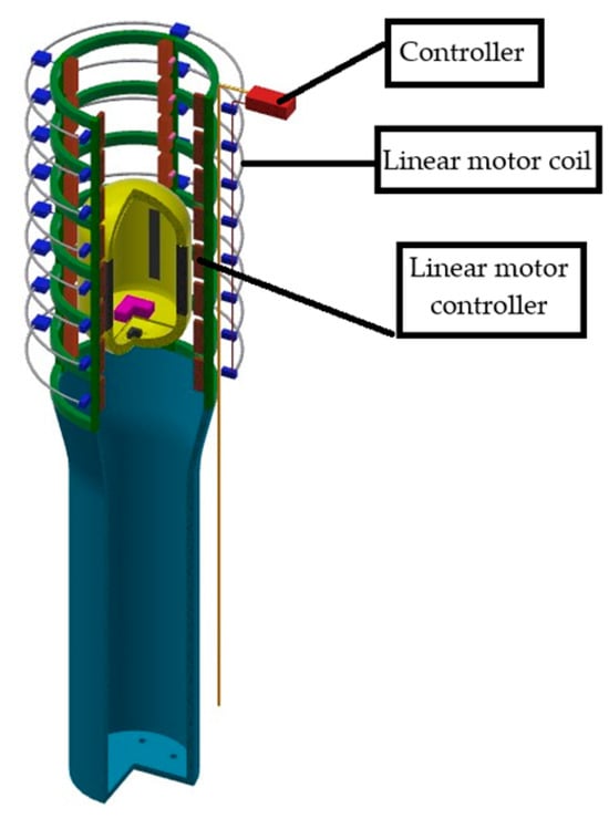 For the development of the propulsion and braking system concept, it was assumed that the total track length available for capsule movement is approximately 900 m. The proposed drive system will enable the capsule to simulate the range between microgravity and Mars gravity conditions. To achieve a state of microgravity lasting approximately 10 s, the capsule is assumed to maintain an acceleration of 9.81 m/s2 over a 500 m section of the track. Under these conditions, after traveling 500 m, the capsule reaches a velocity of approximately 98 m/s (≈356 km/h). To simulate Martian surface gravity, the capsule must maintain an acceleration of 3.68 m/s2. Over a 500 m distance, this corresponds to a velocity of approximately 60 m/s (≈218 km/h). To extend the duration of reduced gravity, the acceleration section may be lengthened to 700–750 m, resulting in terminal velocities of approximately 74 m/s (≈267 km/h) at 750 m.