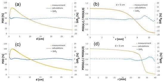 PDDf(di,r) and PDDf(di,0)—the percentage depth dose in water at the same depth di, at a distance r from the beam axis and at the beam axis (r = 0), respectively, calculated using the fitted function, and PDDS(di,r) and PDDS(di,0)—the percentage depth dose in water at the same depth di, at the distance r from the beam axis and in the beam axis, respectively, obtained directly from the simulation.