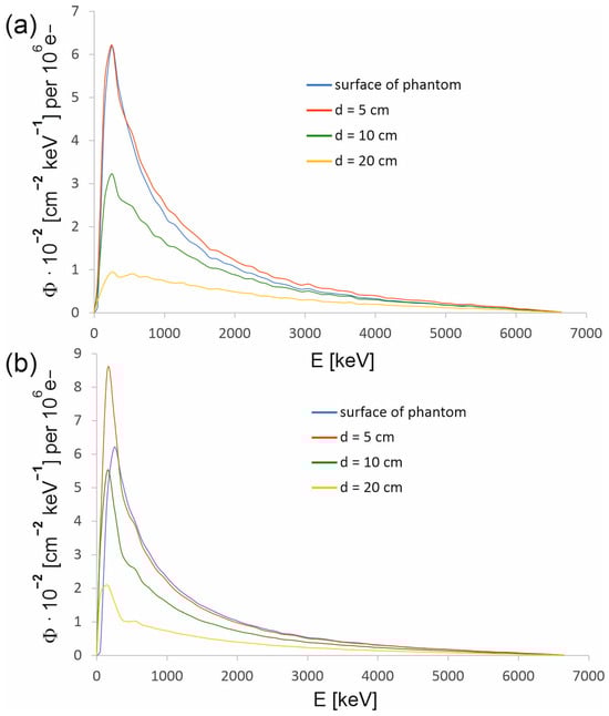 One of the basic parameters characterizing a radiation beam is its energy spectrum. The energy dependencies of the therapeutic beam were determined using the developed model. Figure 4 presents the energy spectra on the surface of the water phantom and at various depths in the beam axis. Figure 6 shows the energy spectra determined at various distances from the beam axis at selected depths in the water phantom. The spectra were expressed as spectral photon fluence (Φ), i.e., the number of photons per energy interval of 1 keV, passing through an area of 1 cm2 as a function of the photon energy. Spectral photon fluence was normalized to one million electrons hitting the conversion target (so-called primary electrons). The photon spectral fluence normalized to the number of primary electrons determined in simulations enables the depth doses to be linked to the current of electrons hitting the target of the CyberKnife M6 device. In the case of spectral photon fluence, the standard deviation did not exceed 1% except for individual cases.