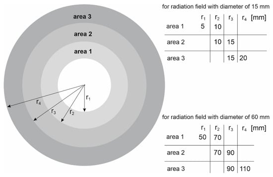 As part of the study, the spectra were also determined in areas outside the therapeutic beam at different distances from the beam axis (Figure 5). Area 1 in the case of the 15 mm diameter field is an exception, because its size and location relative to the beam axis were selected so that this area covers the edge of the profile. The occurrence of a large dose gradient in a relatively large area compared to the entire therapeutic field allowed us to check whether the spectrum representing the edge of the beam is similar to the spectrum in the field or outside the field. It turns out that the spectra from area 1 at the selected depths resemble the spectrum in the field. They are dominated by the beam photons entering the phantom, rather than lower-energy photons originating from the scattering processes in water. The spectra in the areas outside the field are clearly shifted toward a lower energy (Figure 6). Figure 7 shows how the average photon energy E0 changes with a depth d in the water phantom and with a distance r from the beam axis for both fields considered.