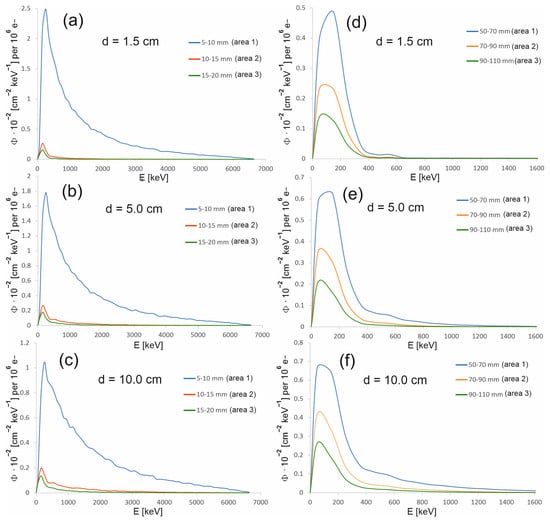 Energy spectra at the selected depths in the water phantom, at various distances from the beam axis for the 15 mm diameter field (a–c) and for the 60 mm diameter field (d–f). The photon spectral fluence Φ was normalized to 106 primary electrons.