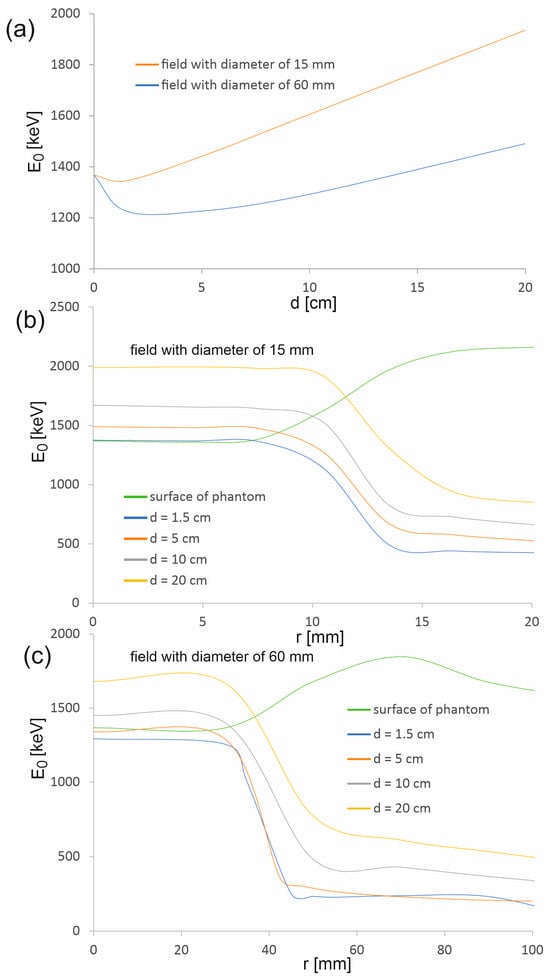Average photon energy in the main axis of the beam (a) as a function of depth d in the water phantom and (b,c) as a function of distance r from the beam axis.