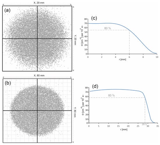 Photon distributions on the phantom surface for the radiation field with a diameter of (a) 15 mm and (b) 60 mm. The photon entry points into the water phantom are represented by dots. Photon fluence distributions Φ on the surface of the water phantom as a function of the distance r from the beam axis (c) for the field with a diameter of 15 mm and (d) for the field with a diameter of 60 mm. The photon fluence Φ was normalized to 106 primary electrons.