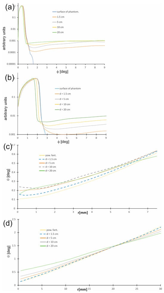 Figure 9a,b show the distribution of directions in which photons travel, called photon propagation directions in the water phantom and on its surface as a function of the angle θ between the photon trajectory direction and the beam axis at selected depths, while Figure 9c,d present the changes in the most probable photon propagation directions depending on the distance r from the beam axis. The distribution of photon propagation directions is related to the radiation field. Generally, within the therapeutic beam, the angles between the directions of photon propagation and the beam axis are small on the phantom surface and do not exceed 1.5 degrees for a 15 mm field, whereas for a 60 mm field, the values are slightly larger, being up to 2.5 degrees. With increasing depth d, the number of photons moving along the trajectories creating larger angles θ increases. Furthermore, regardless of the depth in the phantom, the angle θ increases with increasing distance r from the beam axis.