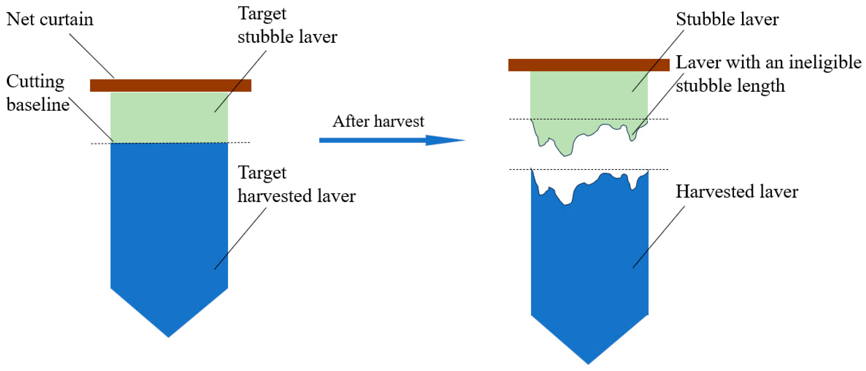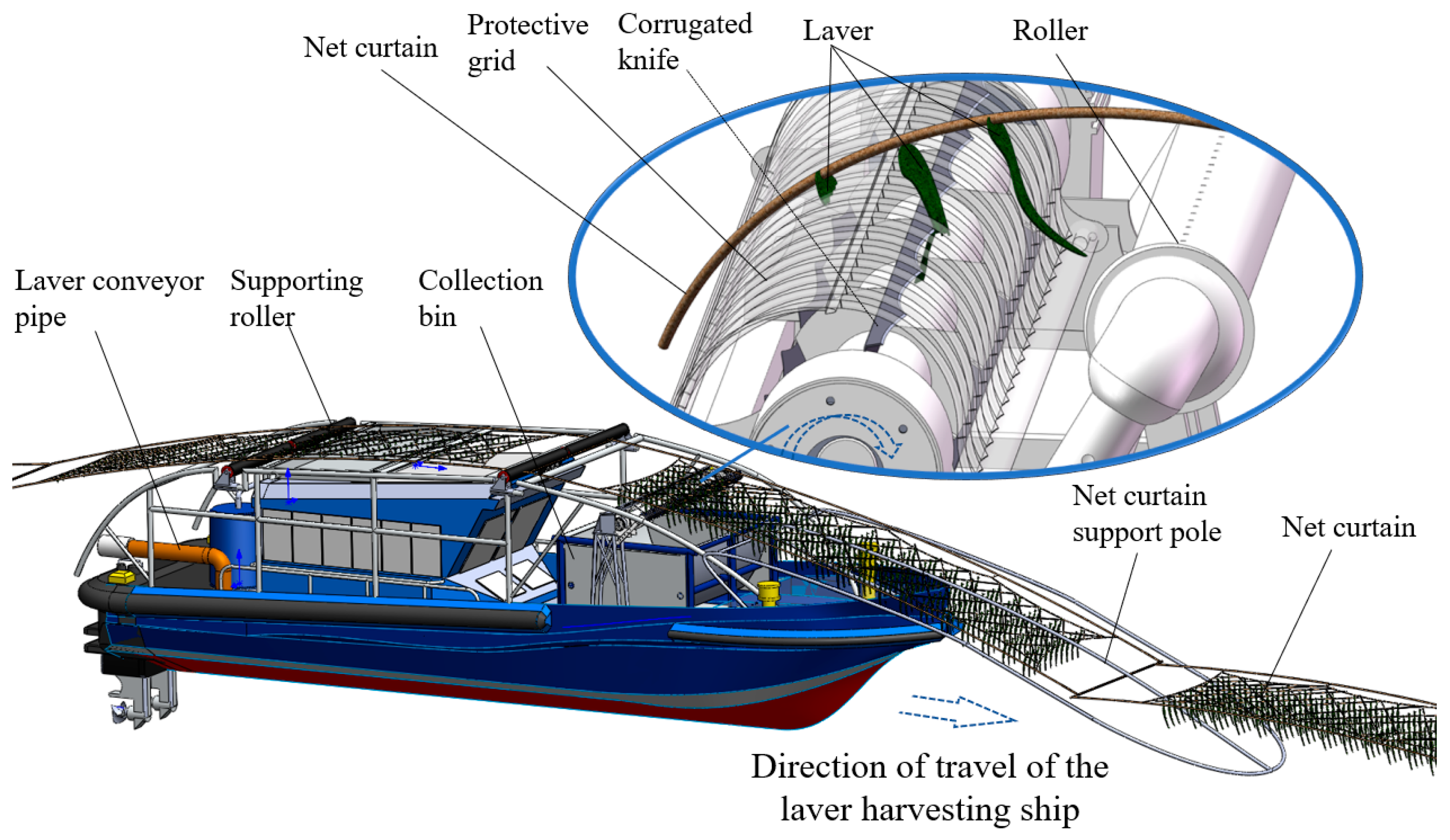 In the comprehensive analysis, the average net recovery rate of laver harvested by corrugated blade was 98.75%, and the average loss rate was 1.85%; both are better than those of the straight cutter harvesting equipment, which reached the requirements of laver harvesting, and the corrugated blade was more favorable for the harvesting of low-loss laver. In the process of harvesting laver by corrugated blade, the net recovery rate of laver is less affected by the rotational speed of the blade and the traveling speed of the net curtain, and the loss rate is more significantly affected. Thus, the rotational speed of the blade can be appropriately reduced, and the boat can be improved in the process of harvesting, so as to increase the efficiency of harvesting of laver, and to reduce the splash loss and the energy loss of the equipment. Therefore, when the rotational speed of the tool is 900 rpm and the speed of the boat is 0.71 m/s, it can meet the requirements of the loss rate and the net recovery rate of laver harvesting, and also have a high harvesting efficiency.