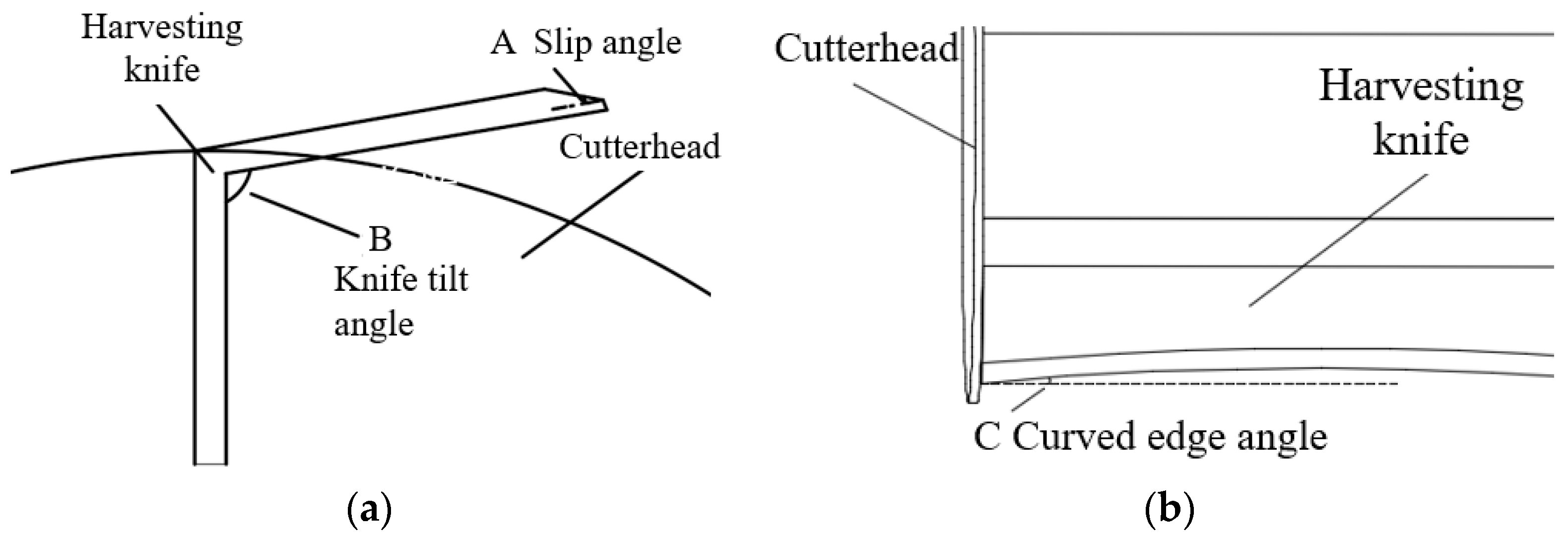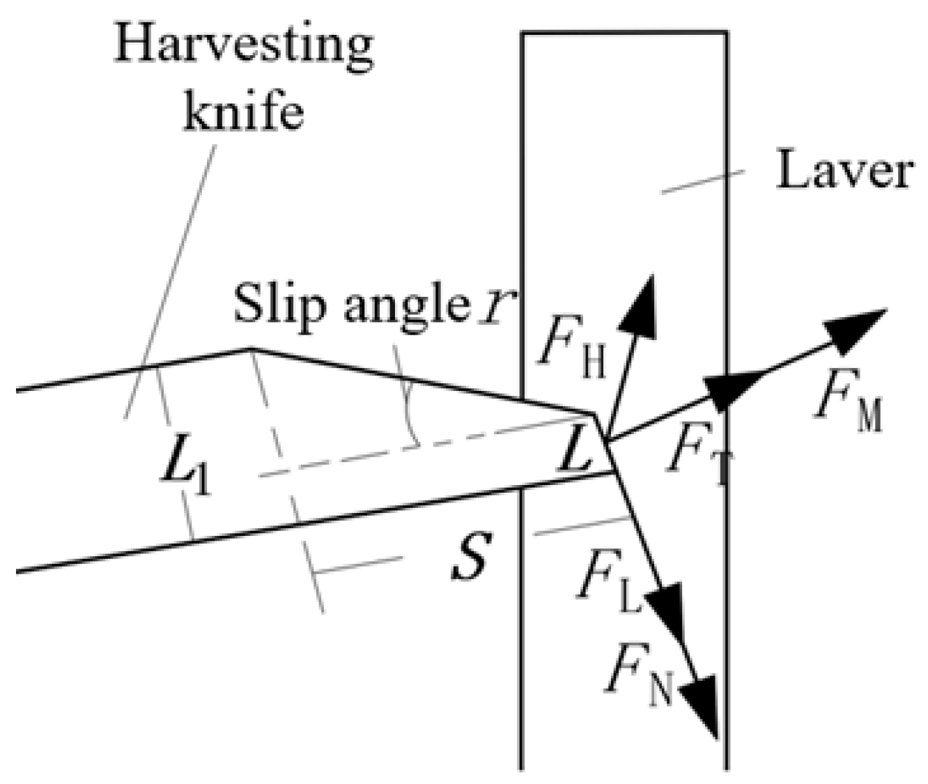 is maximum. The radial force generated by the tool is the largest at this time; the tool provides the largest downward force to the laver and produces the strongest stretching effect on the laver, so the laver may be pulled apart and cause splash loss, which may increase the rate of harvesting loss. When the curved edge angle is between 13 and 15° and the slip angle is between 20° and 25°,