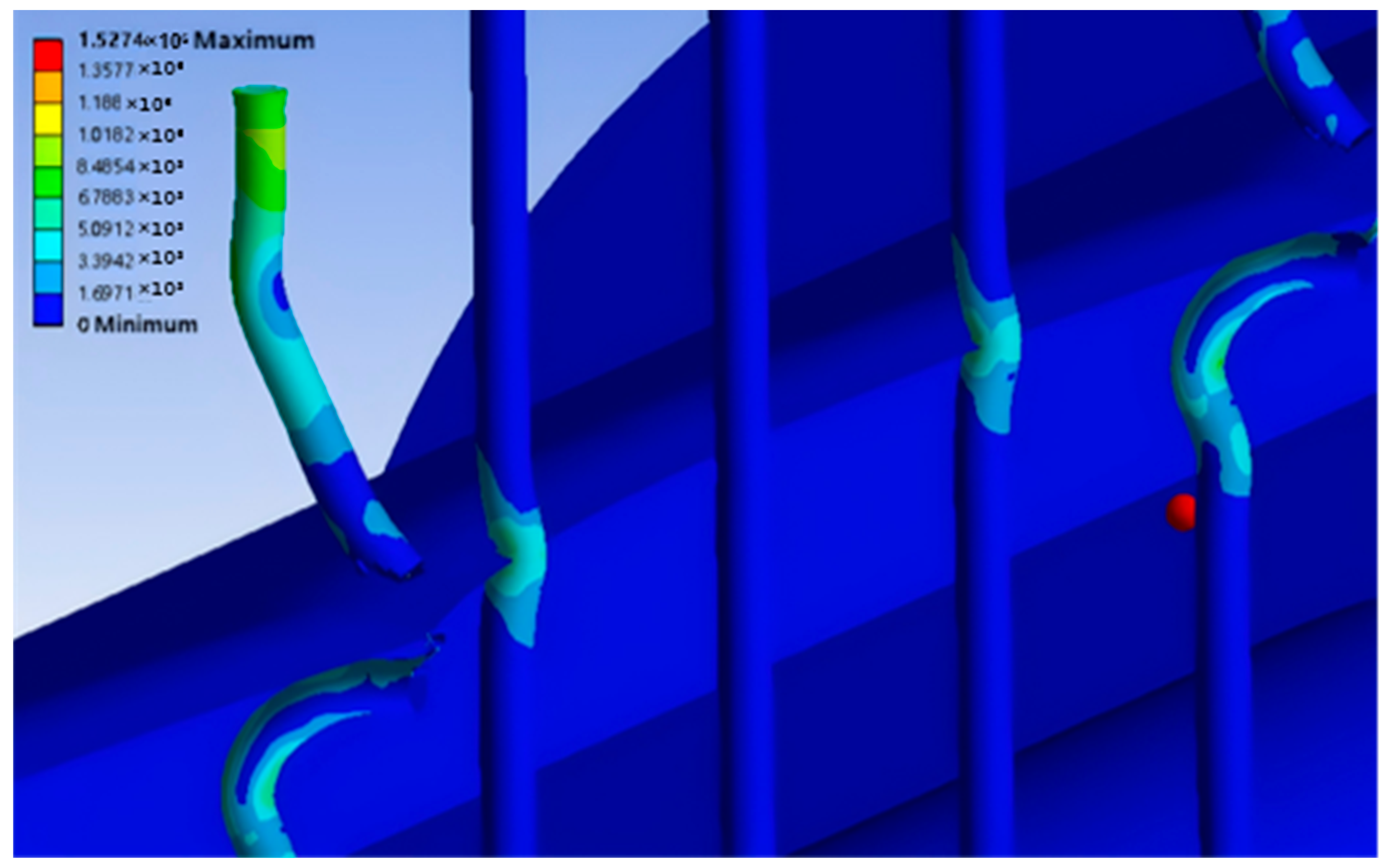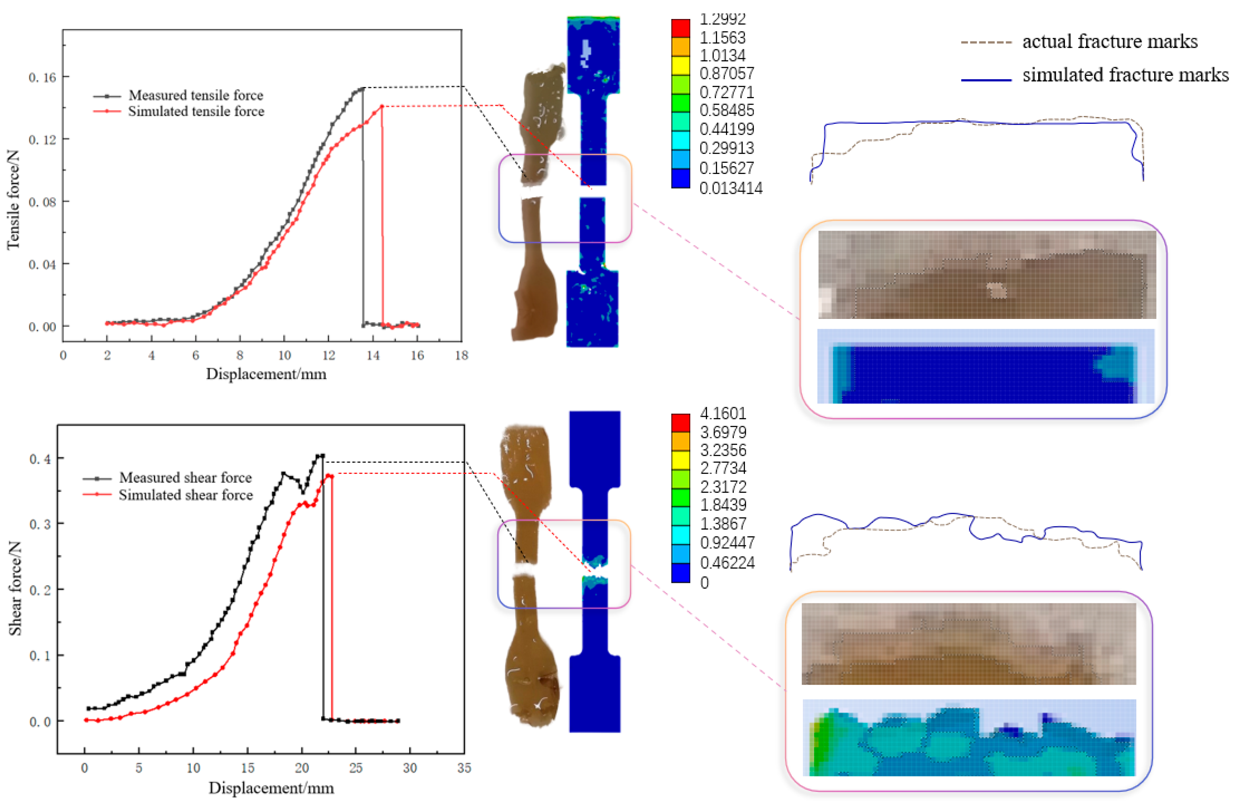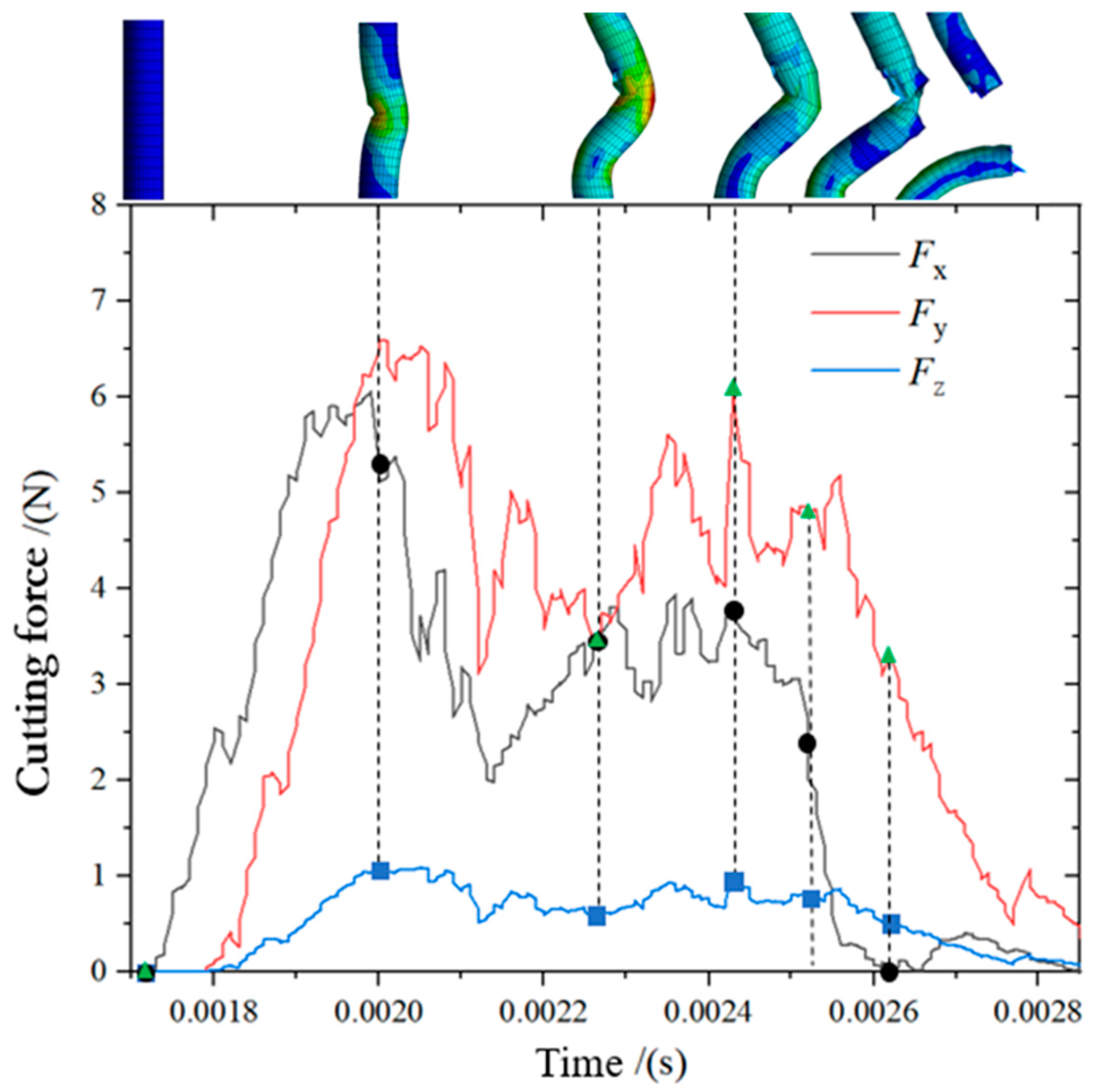 The tool blade in this simulation is corrugated, so at different points in the blade, the laver and tool contact force is also different. So, this simulation test analyses five laver pieces, with laver between the same spacing in the arrangement of the tool’s arc edge, to determine the final test results of the absolute force average value for the five sheets of laver. The test results are shown in