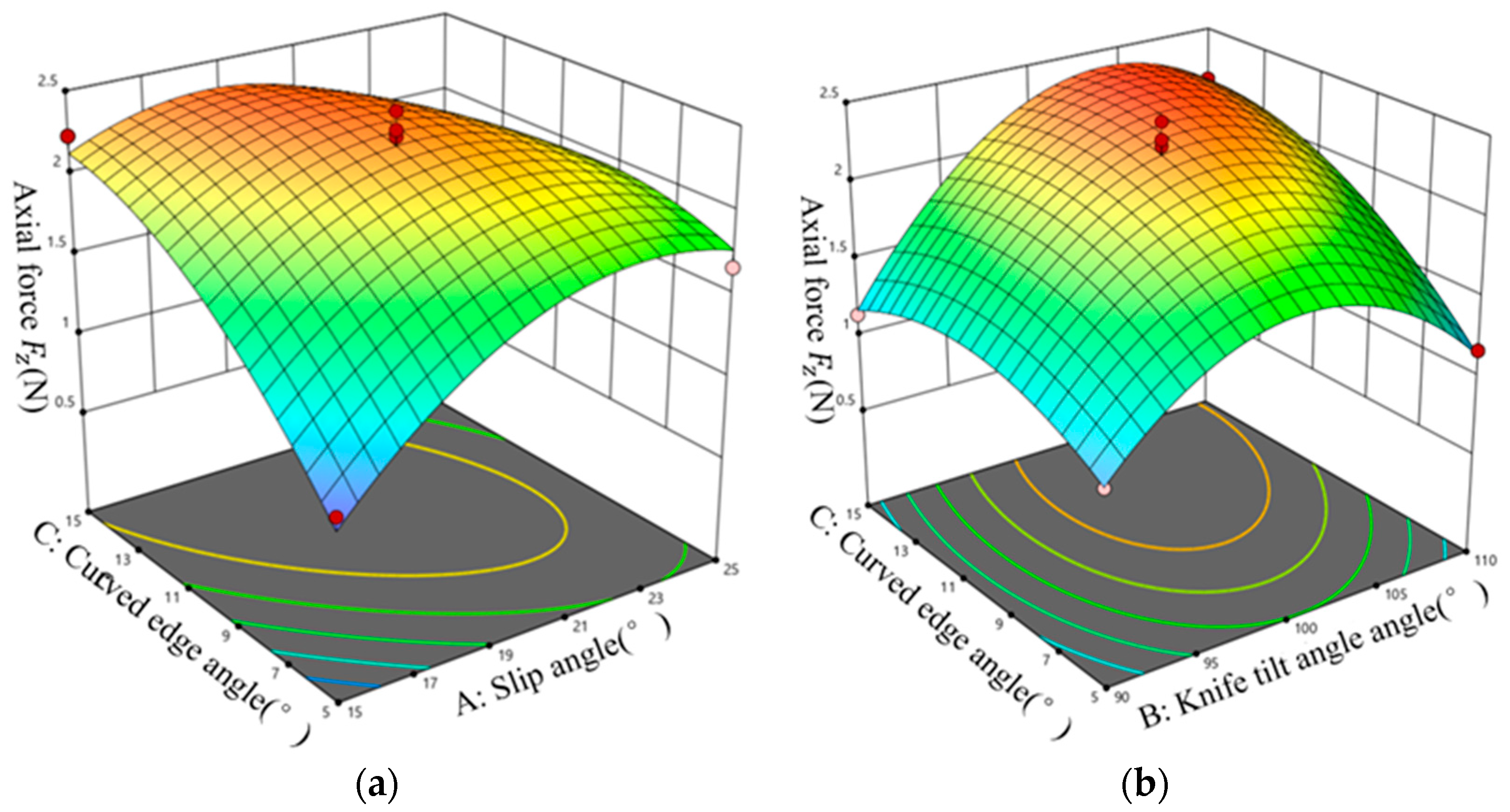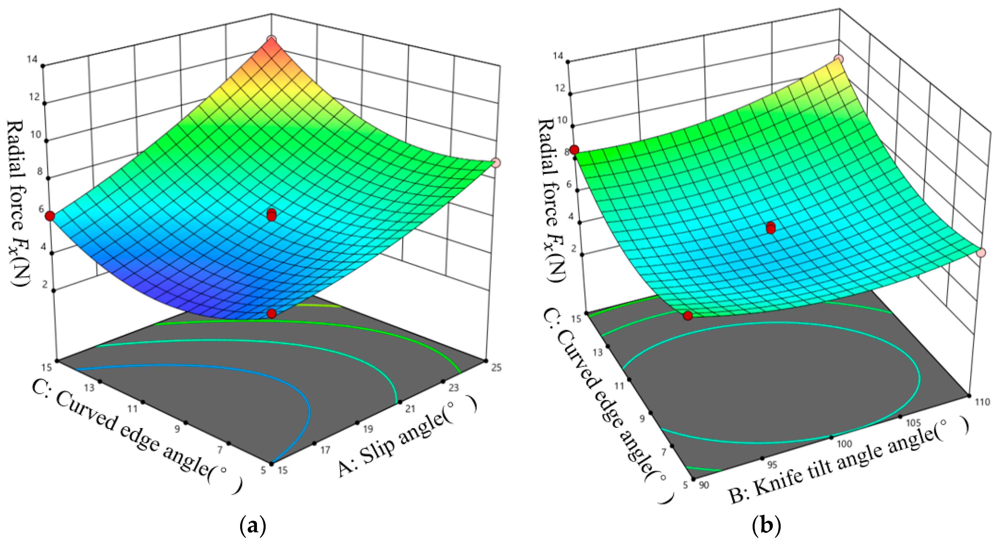 The change in the curved edge angle implies a change in the curved portion of the blade, which may alter the effective rake angle at the moment of impact, thereby affecting the size of . In the case of a constant curved edge angle, with the increase in slip angle, the shows an increasing trend. This is because as the slip angle increases, the blade end becomes sharp and the contact area between the blade and the laver decreases, the pressure increases, and thus the radial cutting force increases. The interaction between the two (AC) reflects the coupling effect of “sharpness” and “cutting angle” on cutting force. This also corresponds with the core innovation of the corrugated blade—turning positive cutting into sliding cutting. Meanwhile, the slip angle and the edge curved edge angle jointly determine the sliding component of the blade relative to the laver, which is the key to reducing cutting resistance and improving cutting quality. When the curved edge angle is between 9 and 11° and the slip angle is 15°, the radial force on the laver is small. When the slip angle is 25° and the curved edge angle is 15°, the radial force on the laver is maximum. From the figure, it can be found that the rate of change of along the direction of slip angle is faster, so the effect of slip angle on is greater than the effect of curved edge angle on .