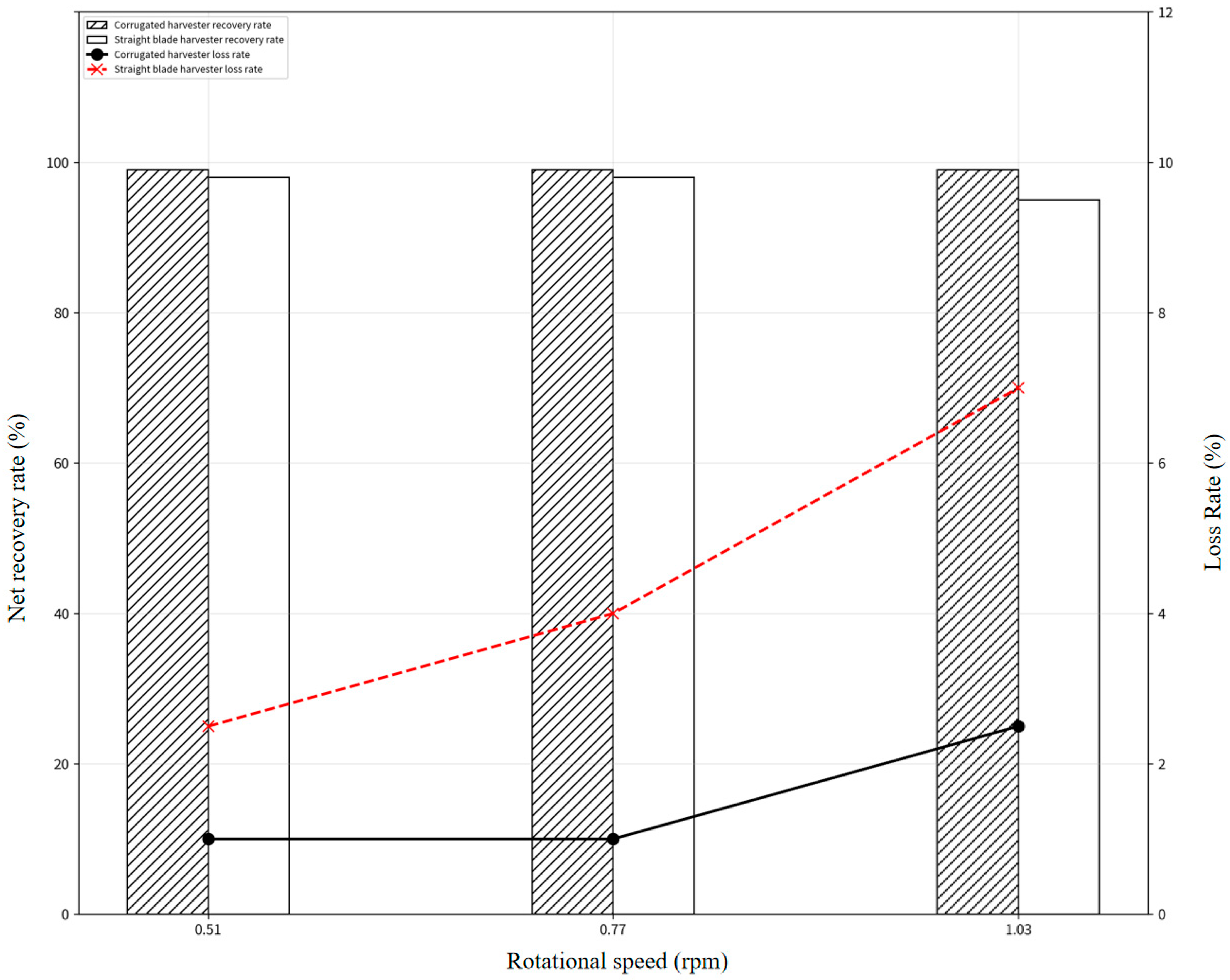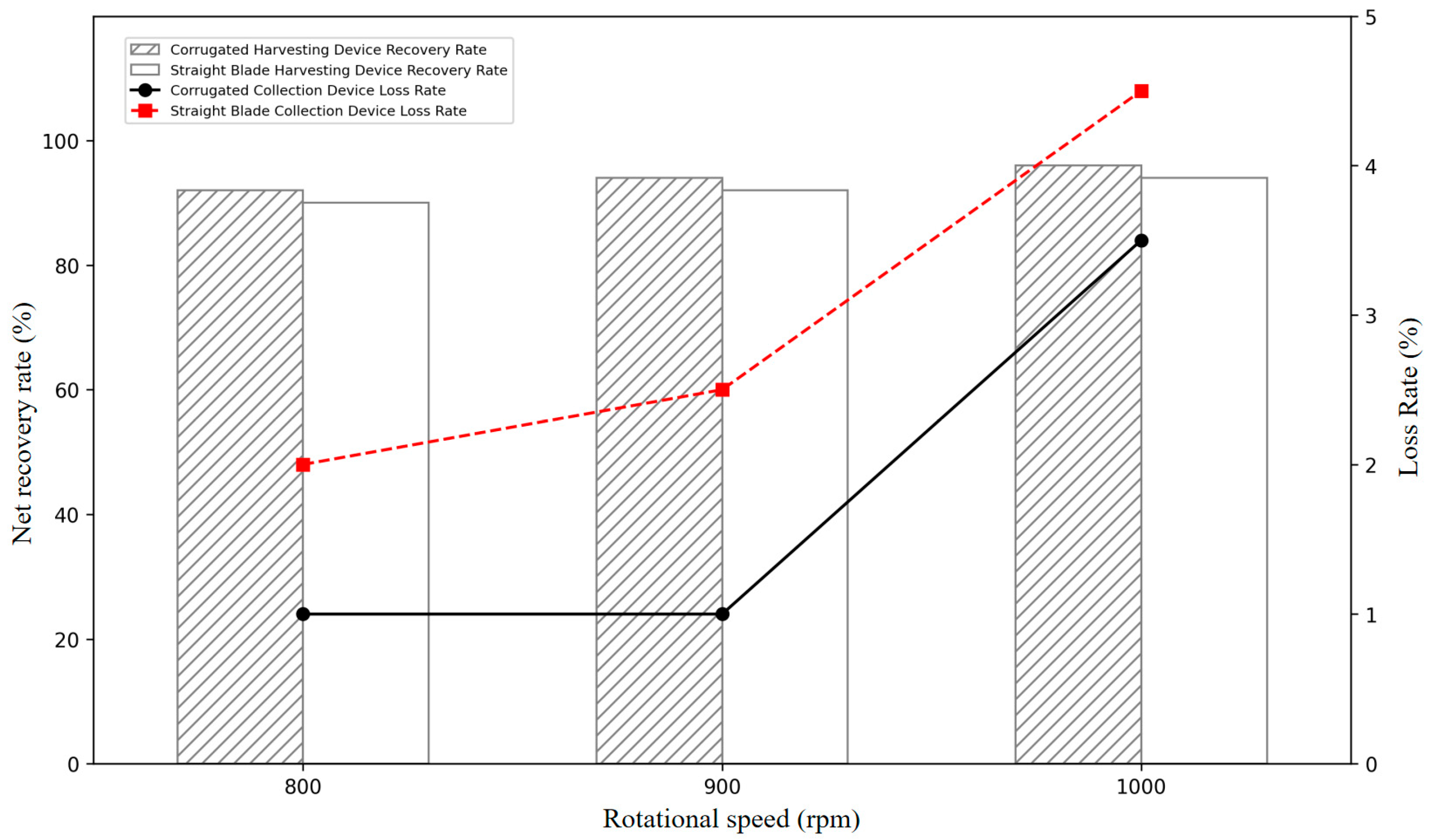 Table 10. When the rotational speeds of the blades were 800 rpm, 900 rpm, and 1000 rpm, the net recovery rate of the corrugated blades was 98.98%, 98.49%, and 98.91%, and the loss rate was 1.16%, 1.27%, and 3.38%, respectively.