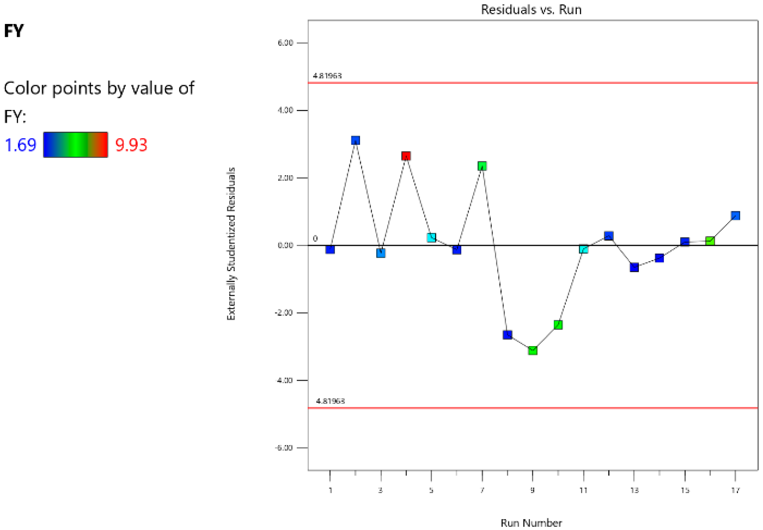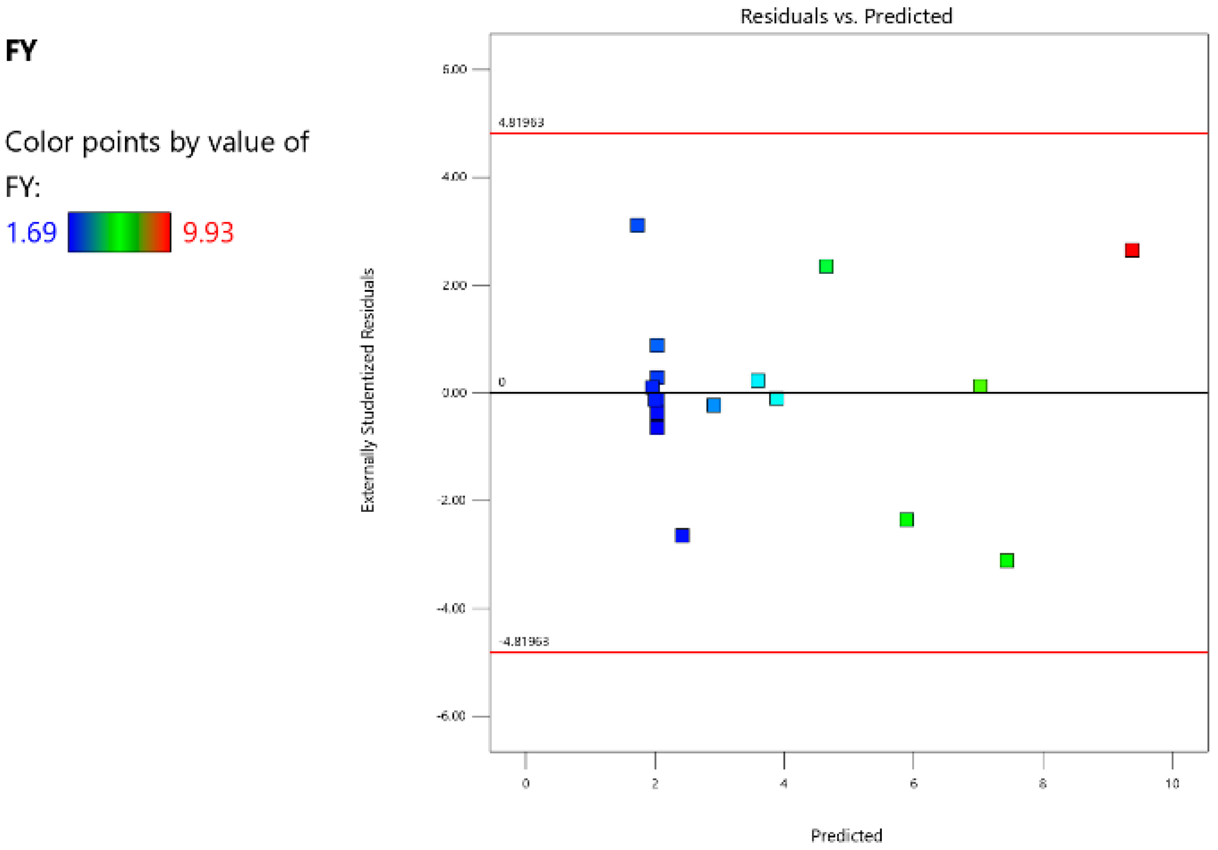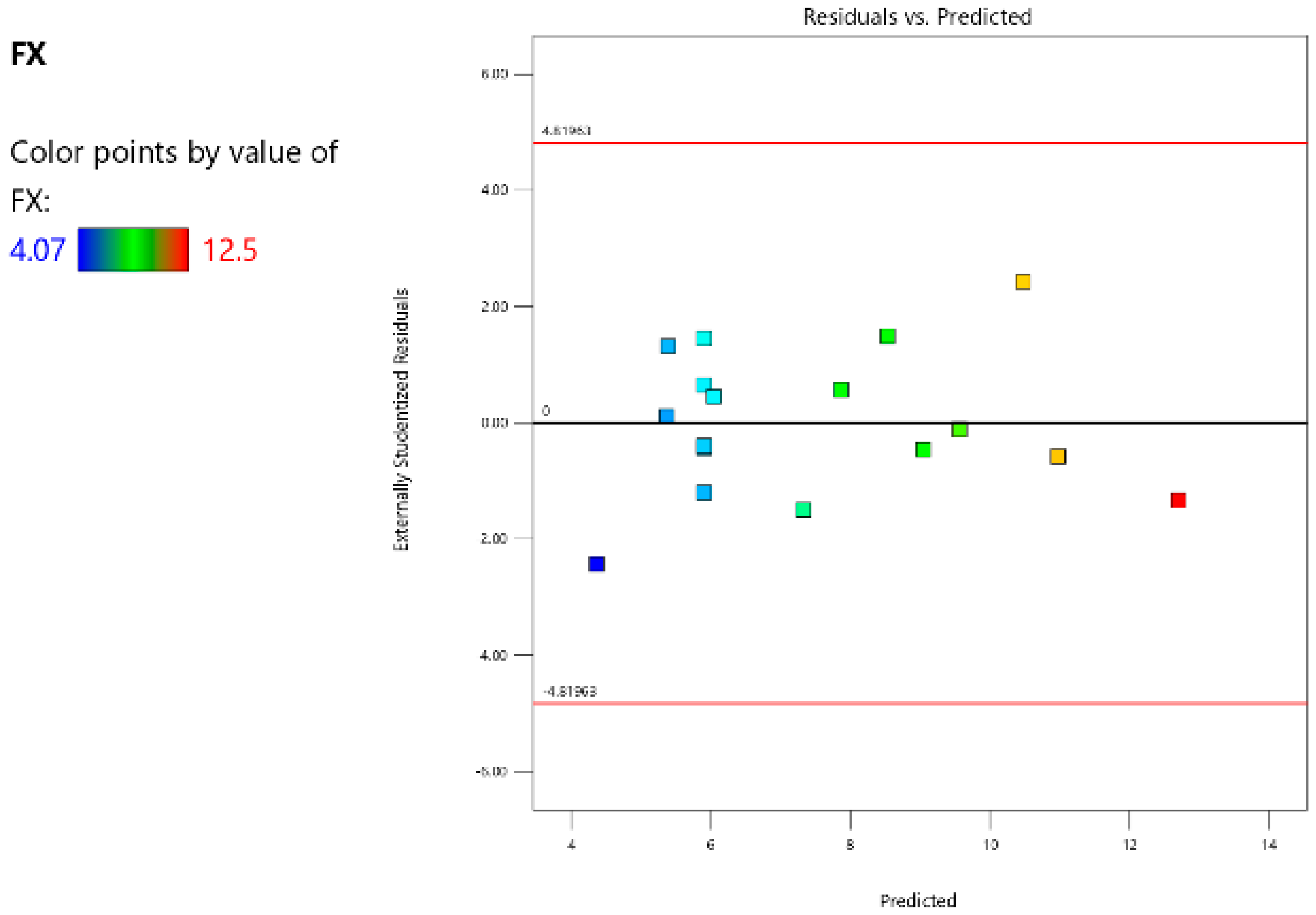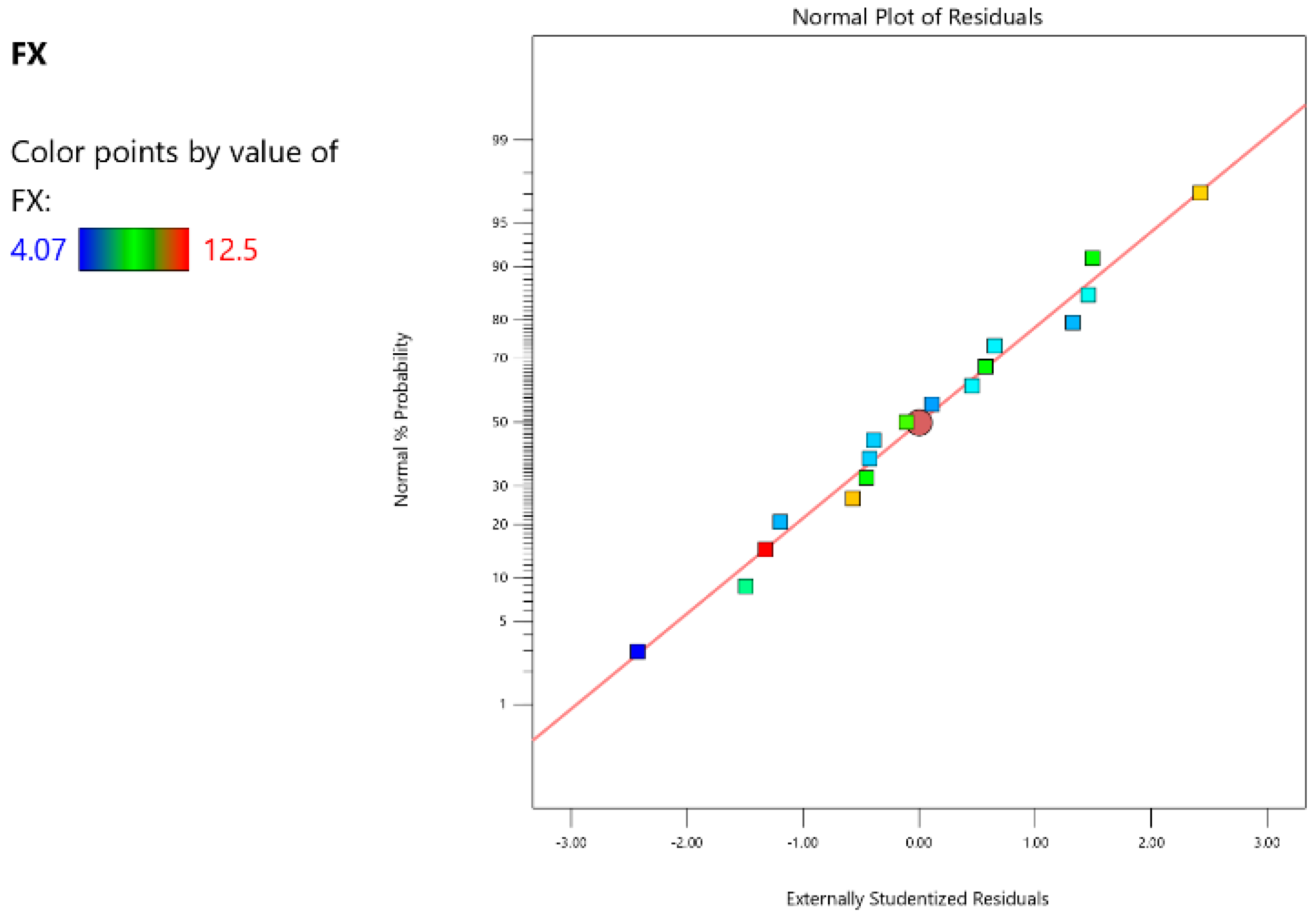 p-value of the regression model is less than 0.0001, indicating that the model is highly significant, the out-of-fit term is not significant, and the model is usable. The reliability of the model was validated through regression diagnosis (see