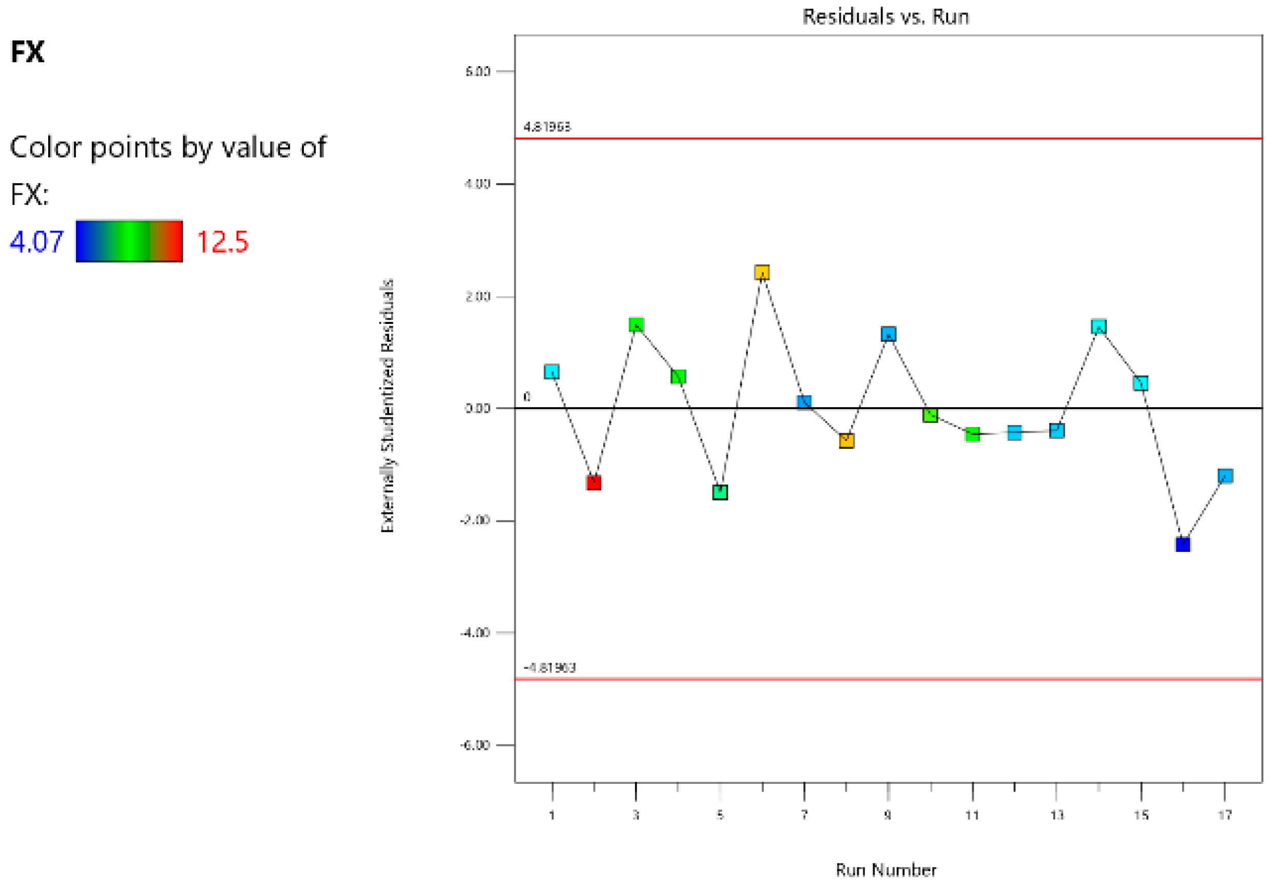 After removing the insignificant term AB, the adjusted R2 of the simplified model slightly increased from 0.9824 to 0.9845, indicating that the explanatory power of the model for the experimental data was not affected and was slightly improved. More importantly, the predicted R2 significantly increased from 0.9278 to 0.9507, indicating that the simplified model’s predictive ability for new data has been further enhanced. Meanwhile, the standard deviation of the residuals decreased from 0.3156 to 0.2957, indicating an improvement in the accuracy of the model.