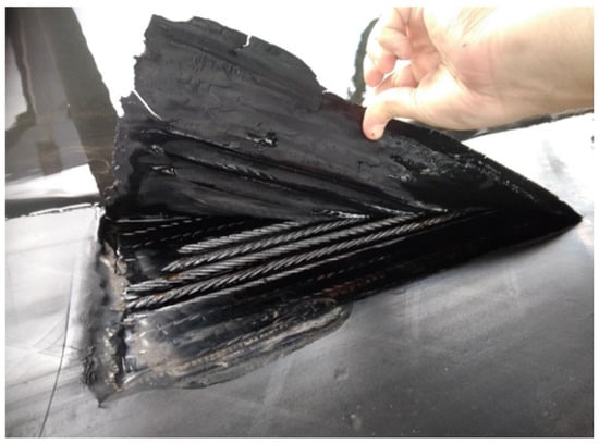 In steel cord conveyor belts, the most critical failures concern the belt core. Fracture or corrosion of the steel cords leads to a loss of tensile strength, which can result in belt rupture during operation [43,51]. Examples of steel cord core damage detected during belt preparation for regeneration (after cover removal by milling) are shown in Figure 6.