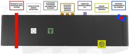 Fulfilling these requirements necessitates the integration of non-destructive sensing techniques—vision, magnetic, acoustic, and thermal—into a unified diagnostic and monitoring framework. Such solutions align with the concept of sensor-based monitoring and the development of digital twin systems for conveyor transportation [12,46].