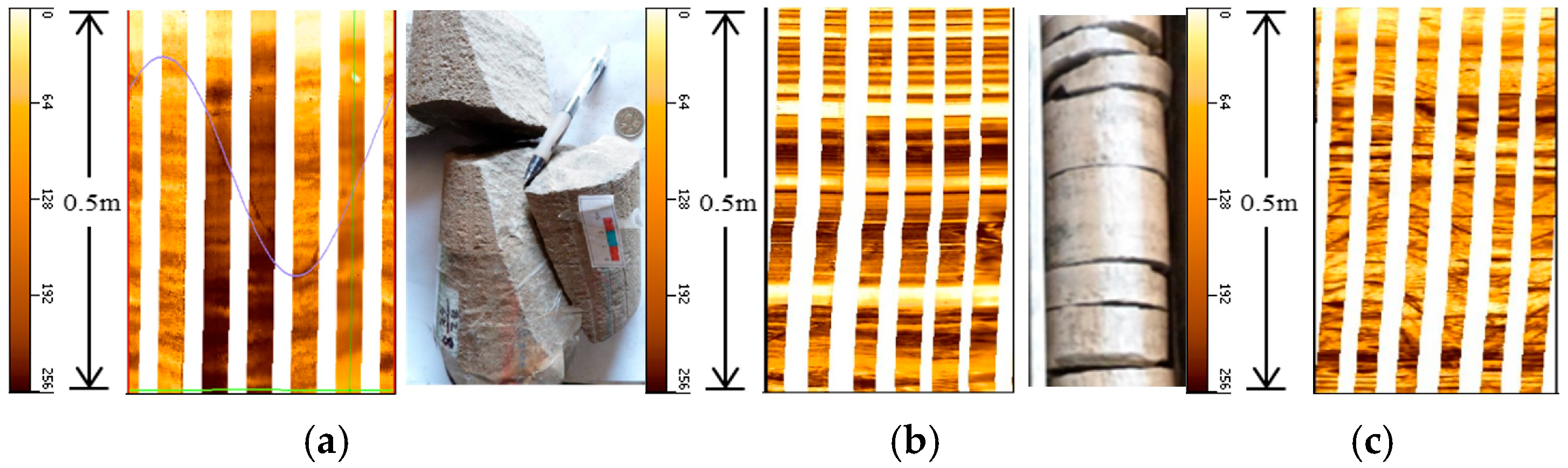 - Lai, J.; Wang, G.; Wang, S.; Cao, J.; Li, M.; Pang, X.; Han, C.; Fan, X.; Yang, L.; He, Z.; et al. A review on the applications of image logs in structural analysis and sedimentary characterization. Mar. Pet. Geol. 2018, 95, 139–166. [Google Scholar] [CrossRef]
