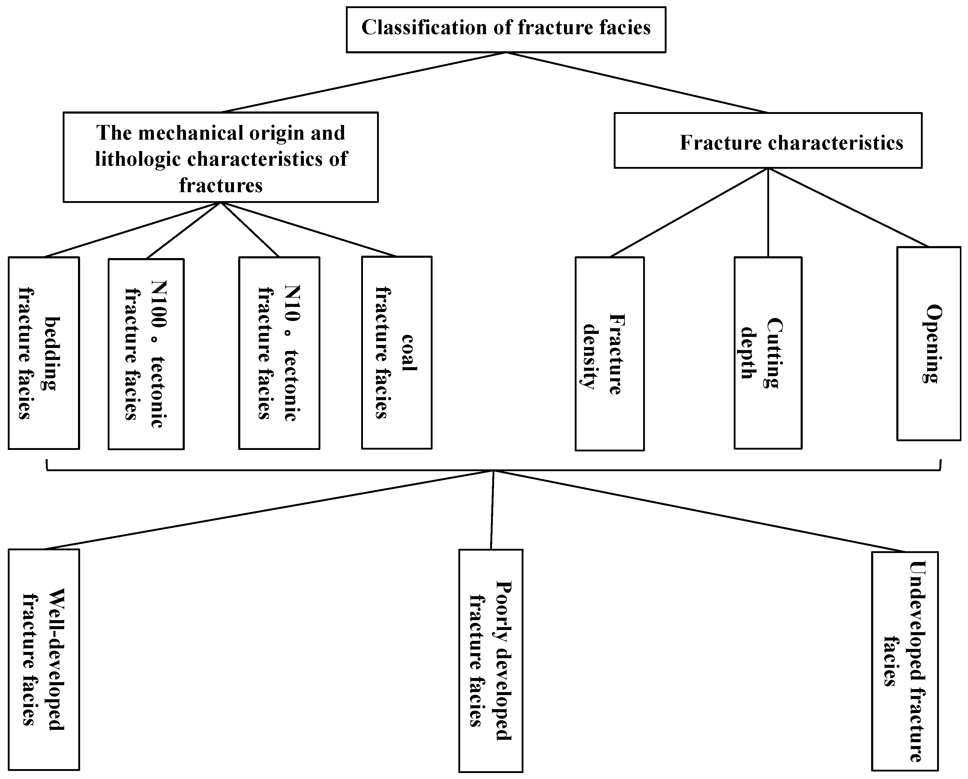 - Fractures were identified by integrating characteristics observed from both image logs and core samples. The genetic types, occurrence, opening, cutting depth, lithology and density of the fractures were considered in the fracture facies research. The fractures in the study area were divided into 4 facies types: bedding fracture facies, N100° tectonic fracture facies, N10° tectonic fracture facies and coal fracture facies. The different genetic fractures were further divided into the following three types according to the degree of fracture development: well-developed fracture facies, poorly developed fracture facies and undeveloped fracture facies.