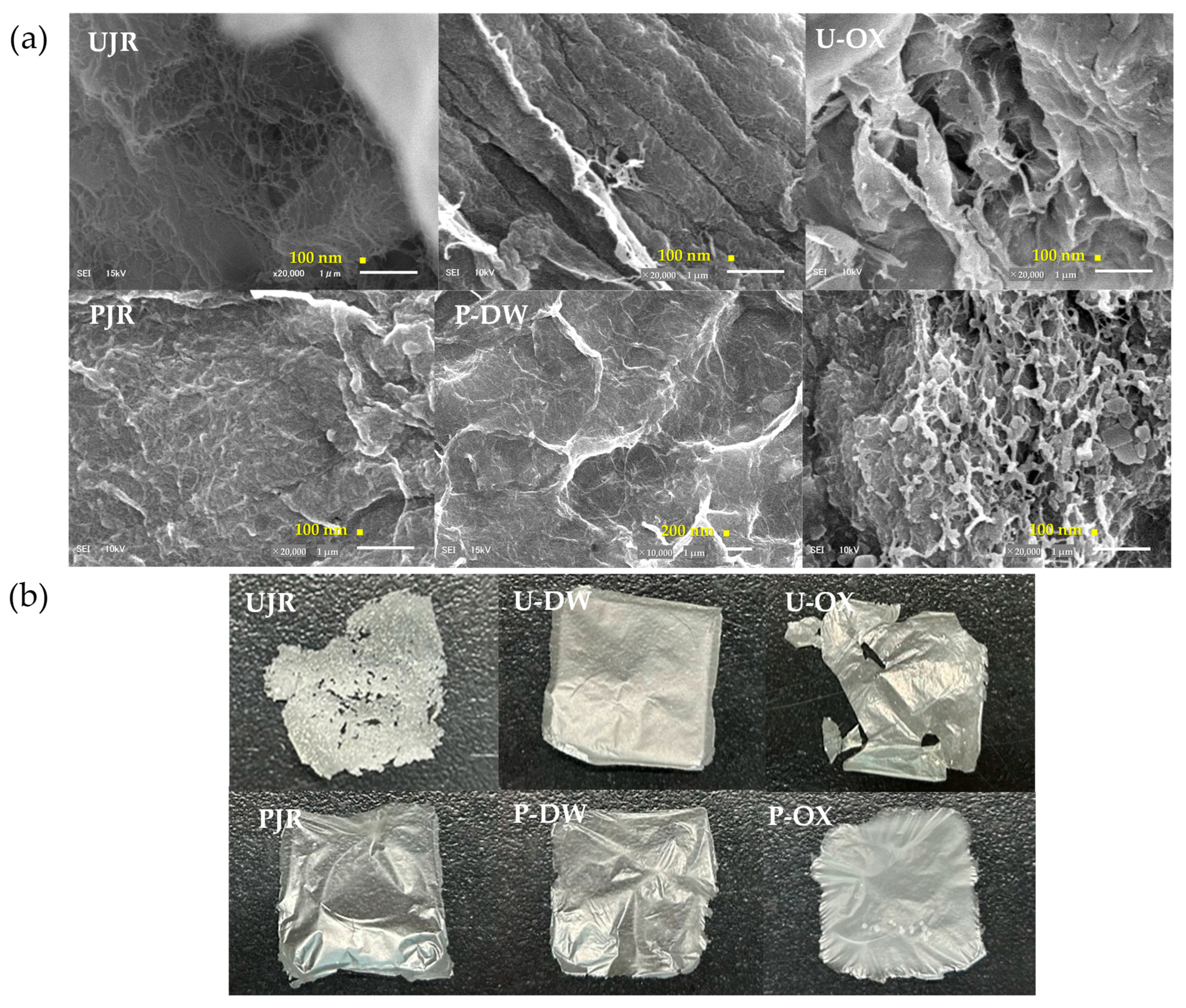 Scanning electron microscope images of the samples: (a) appearance of films upon visual inspection after sonication (b) after sonication followed by ethanol replacement and air-drying. UJR, untreated juice extraction residue; U-DW, juice extraction residue after pectin extraction in deionized water; U-OX, juice extraction residue after pectin extraction in sodium oxalate solution; PJR, purified cellulose from UJR; P-DW, purified cellulose from U-DW; P-OX, purified cellulose from U-OX.