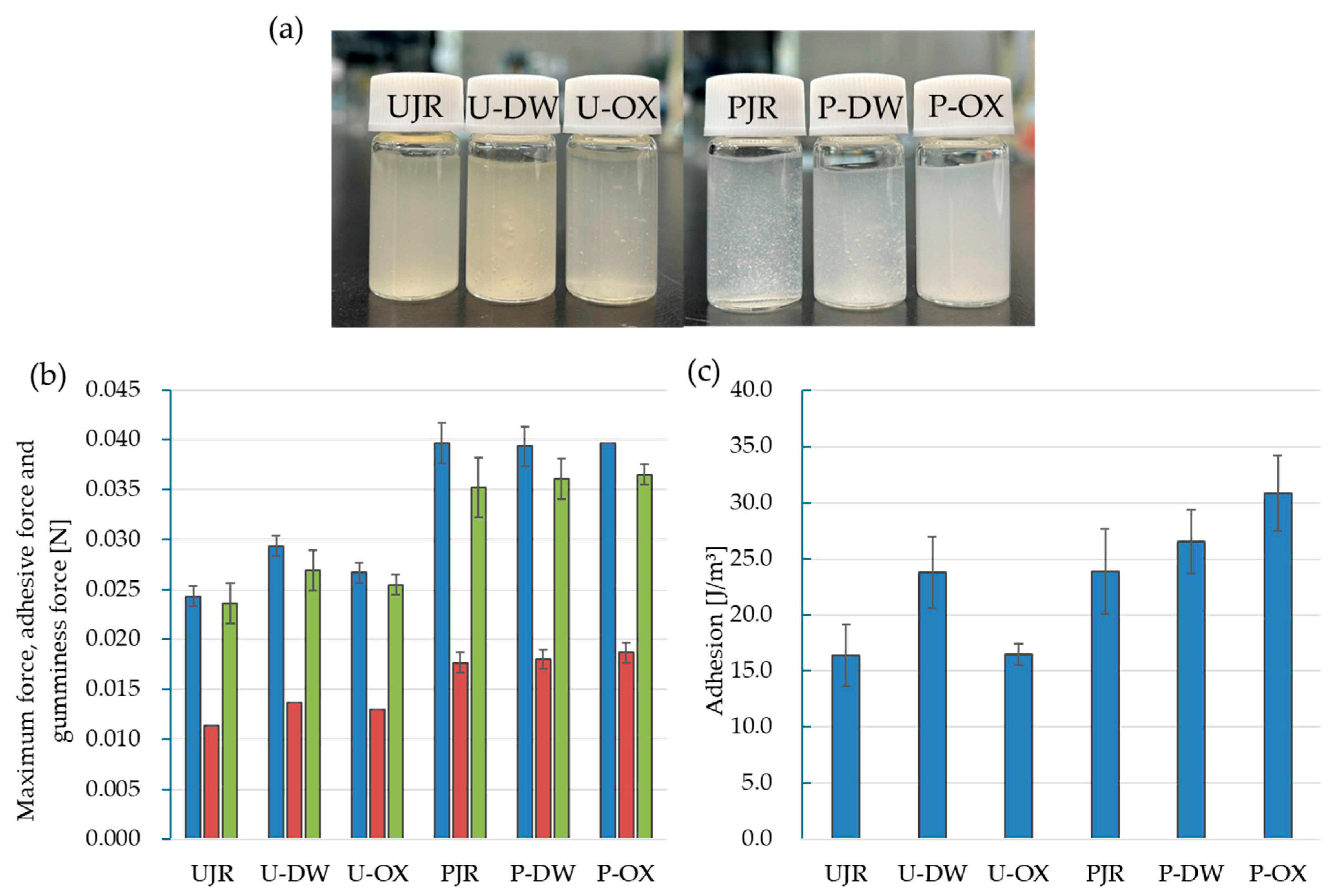 Sample appearance (a) after sonication and (b) texture profiles including (b) maximum (blue), adhesive (red), gumminess forces (green), and (c) adhesion. UJR, untreated juice extraction residue; U-DW, juice extraction residue after pectin extraction in deionized water; U-OX, juice extraction residue after pectin extraction in sodium oxalate solution; PJR, purified cellulose from UJR; P-DW, purified cellulose from U-DW; P-OX, purified cellulose from U-OX.
