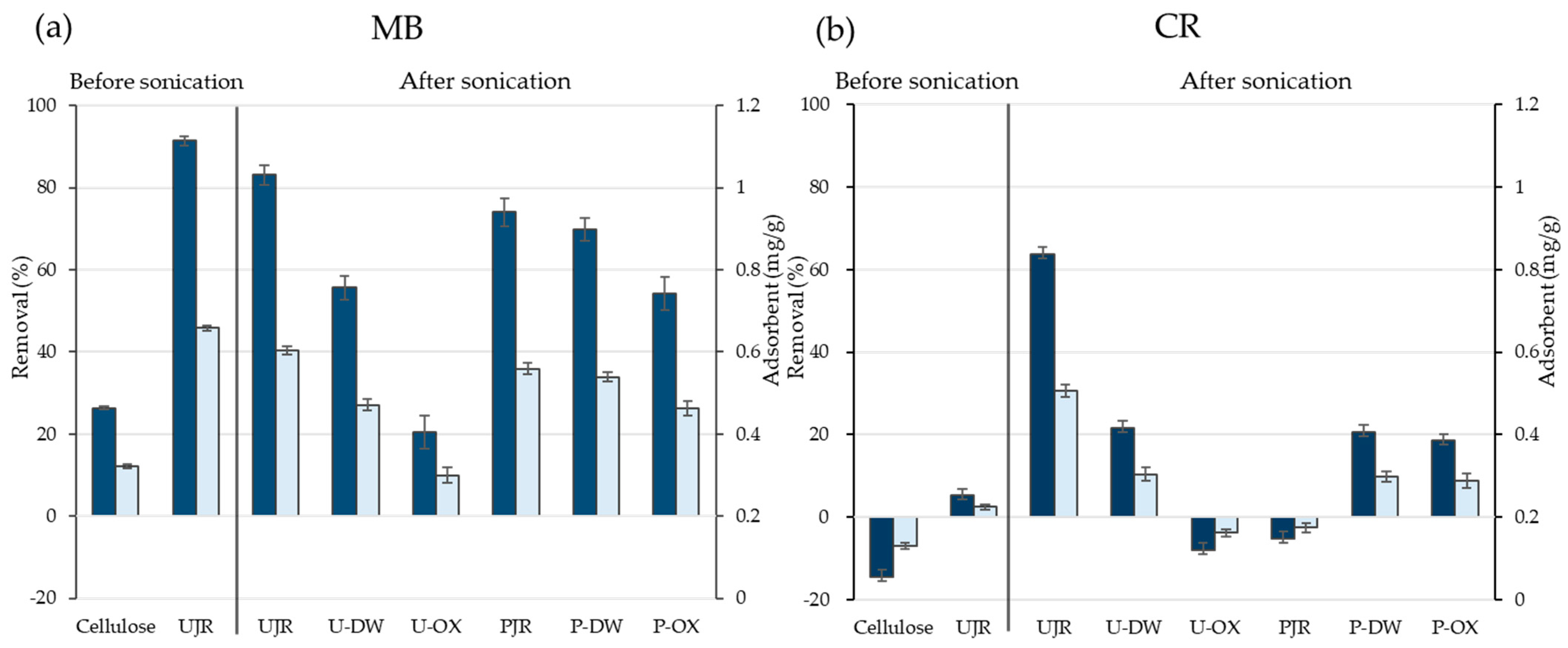 Figure 5a,b show the removal rates and adsorption capacities of each sample for MB and CR, respectively. The sonicated UJR exhibited a high removal rate and adsorption capacity for both MB and CR. A study of the adsorption capacity of unsonicated UJR showed a similarly high removal rate for MB but a low adsorption capacity for CR. This observation suggests that surface fibrillation owing to sonication increases the specific surface area, providing more adsorption sites for CR adsorption [