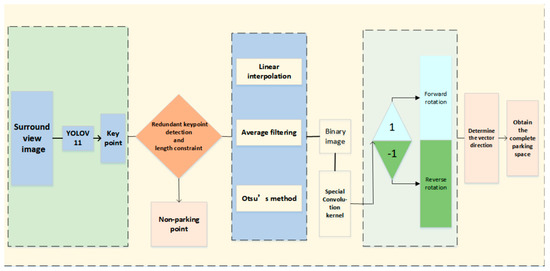 After obtaining the location information of the key points of the parking space, the classic method is to use the simplified version of VGGNet proposed by Zhang et al. to classify the key points of the parking space, and the subsequent work is also based on this approach. Kumar VR et al. integrate global and local information to improve the accuracy of parking spot detection [39]. Min et al. first detect parking spots in the spliced ring view, use the detected parking spots as nodes in the diagram, and then adopt a Transformer-based approach. The attention information aggregation and location coding of parking spots are carried out. Finally, a multi-layer perceptron (MLP) is used to make a binary classification judgment on whether a pair of parking spots can form a parking space [40]. However, when the key point location is located, after simple image processing, we believe that the obtained image has very obvious features and little noise interference. Traditional computer vision can be used to process the image extracted by the YOLO network. We construct a convolution kernel whose size is consistent with that of the extracted key point image. This convolution kernel is used to identify whether the parking space is clockwise or counterclockwise, and use the principle that the key points are in pairs to identify the orientation of the parking space, and finally use the characteristics of the parking space to complete the positioning of the parking space.
