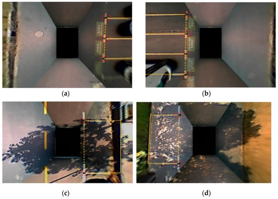 As shown in Figure 4c,d, (c) represents the first erroneous inference of the parking space entrance line, while (d) represents the second incorrect inference of the parking space entrance line. The reason for these two types of errors is that in order to identify the entrance line of the parking space more comprehensively, the values of are appropriately increased.