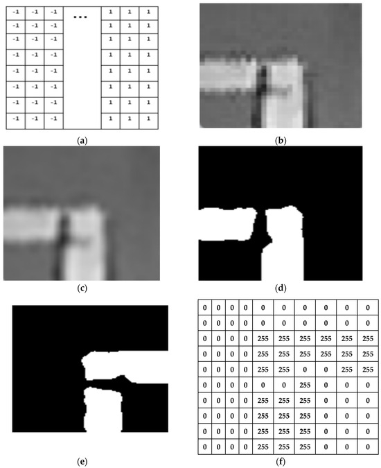 (a) The convolution kernel proposed for judging the turn of the parking space; (b) YoloV11 extracts the target frame containing the key points. In the subsequent operations, linear interpolation is used to enlarge the image to a resolution of 126 × 126. There will be noise disturbance at the parking space boundary. (c) On the basis of Figure (b), the average filtering process with the convolution kernel size of 7 × 7 makes the image more smooth. (d) Binary image of a clockwise-rotated vertical parking space. (e) Binary image of a clockwise-rotated vertical parking space. (f) Binary image of a counterclockwise-rotated vertical parking space.