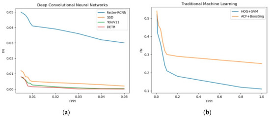 In Figure 7, we present statistics on FN and FPPI of two classical machine learning algorithms and four deep learning-based algorithms, including YoloV11, in the identification of key points of parking spaces. We found that in the detection task of key points of parking Spaces, the depth-based algorithm generally showed better performance in the verification set. In particular, YoloV11 and DETR were very close in accuracy.