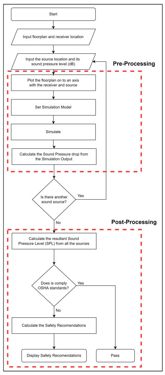 Traditionally, a noise floor is created through manual measurement and mapping of the environment. This method is only applicable for the stages after workers have been exposed to noise-related risks. As for noise prediction, the methods available are minimal and resource-intensive. Therefore, a simple simulation algorithm would help predict noise levels and mitigate risk. Currently, researchers utilise several noise simulation techniques, but these methods have their limitations. There have been studies conducted using the SCANAM method (Simple Cheap Accurate Noise Assessment Method) [], the Building Information Modelling (BIM) method [], and the 4D acoustic simulation approach []. The SCANAM method provides a cost-effective and precise means of measuring sound exposure; however, it is not suitable for simulation purposes. The BIM method and the 4D acoustic simulation approach are capable of performing simulations and predicting outcomes, but these methods are not readily applicable. Each of the current techniques have common disadvantages, which include the lack of a user-friendly GUI, no customizability for specific scenarios, and an inability to integrate occupational safety and health regulations into the analysis code.