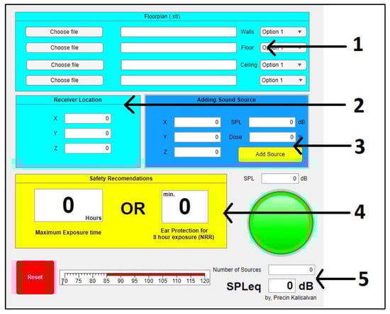 Sections in the graphical user interface (1—file upload, 2—receiver information, 3—source information, 4—safety recommendations, and 5—resultant SPL).