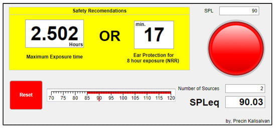 With the GUI design completed, the final step involves integrating the pre-processing and post-processing components with the interface to create a fully functional application. The resultant Sound Pressure Level (SPL) is displayed on the GUI using a gauge, giving users a visual representation of the noise levels. This resultant SPL is then utilised in calculations for the maximum allowable exposure time and the minimum Noise Reduction Rating (NRR) for ear protection, with these values also presented on the GUI. A reset button was also implemented to restore all values to their initial settings, allowing users to restart the simulation process seamlessly. Figure 4 illustrates a scenario where the resultant SPL exceeds the permissible limit.