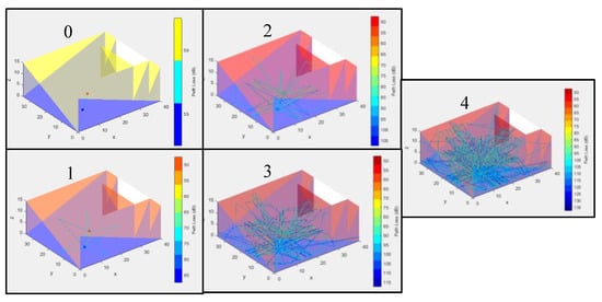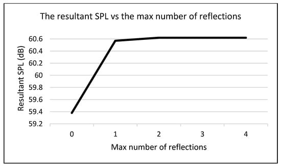 As outlined in the Section 2, the number of reflections was incrementally increased from zero to assess the impact on the resultant Sound Pressure Level (SPL). Figure 7 illustrates the ray diagrams corresponding to each number of reflections utilised in this verification process. Figure 8 presents a line graph depicting the collected data, which indicates that the results stabilise at two reflections. The testing revealed that the resultant SPL remains consistent across three iterations, from two to four maximum reflections. Consequently, it can be concluded that any additional reflections beyond four contribute negligibly to the results. Therefore, the maximum number of reflections is established at four for subsequent simulations.