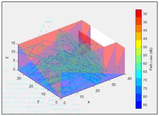 The second sound source is then incorporated, prompting the ray tracing engine to run again and produce the ray diagram for this additional source, which has an SPL of 26 dB. Combining both sound sources at the receiver’s location, the resultant SPL is calculated to be 36.41 dB. This is the same with the manually calculated SPL. Figure 10 illustrates the three-dimensional ray diagram generated during the simulation verification process.