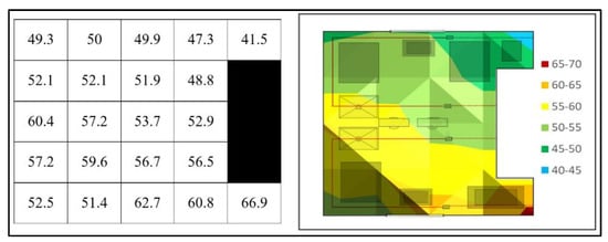 The factory layout was systematically reviewed and divided into a coordinate grid. Readings were taken at each designated point, with each measurement involving holding the measuring device at the location for a duration of 30 s. The measuring device employed for this assessment was the NIOSH Sound Level Meter (SLM) application, utilised with an i436 external microphone, a calibrated measurement microphone adhering to the IEC 61672 [] Class 2 sound level meter standard. The microphone was positioned around the tester’s head and angled directly at the noise source at 30 to 45 degrees to ensure accurate readings.