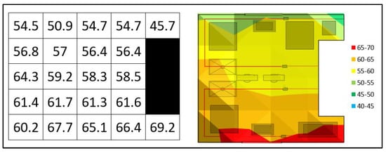 The measurements obtained throughout the factory are tabulated and represented in a sound-level map, as illustrated in Figure 11. Notably, the sound levels are significantly higher in the lower section of the factory compared to other areas, attributable to the facility operating at only 50% of its capacity, with only one production line. Subsequently, the positions of the sound sources are identified, and their respective Sound Pressure Levels (SPLs) are measured. These locations are documented based on estimated distances from the nearest walls to facilitate accurate plotting on the floor plan. The sound sources are associated with specific workstations, which collectively encompass a substantial area; consequently, the SPL is recorded at the midpoint of each workstation area. Measurements are conducted at a height of 2 m from the ground to ensure consistency. The locations and SPLs of the sound sources are summarised in Table 4.