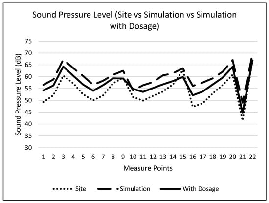 The scenario is simulated using the developed algorithm by utilising the source data presented in Table 4 and the factory’s floor plan. The resulting simulated Sound Pressure Levels (SPLs) are plotted on a grid and represented on a sound level map, as illustrated in Figure 12. Given that only one side of the factory was operational during measurements, this is depicted in the sound level map. A comparative analysis of both datasets focuses on the differences in dB values and the percentage differences. Figure 13 presents a line graph illustrating a comparison between the SPLs measured on site and those obtained from the simulation. The graph demonstrates that the simulation closely follows the trend of the real-world data, validating the algorithm’s functionality.
