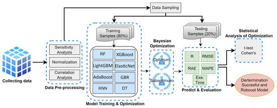 Eight machine learning models were trained using 80% of the dataset during the training phase, while the remaining 20% of the data was reserved for testing. The parameters of all models were optimized using Bayesian optimization. The selection of the best-performing model was based on the hyperparameter combinations that maximized the R value. To identify the most robust model, those capable of achieving high accuracy under suboptimal conditions—specifically, those with the highest minimum R values even under adverse conditions—were preferred. This approach allowed for assessing a model’s robustness by considering not only its optimal (best-case) performance but also its performance under suboptimal (worst-case) conditions.