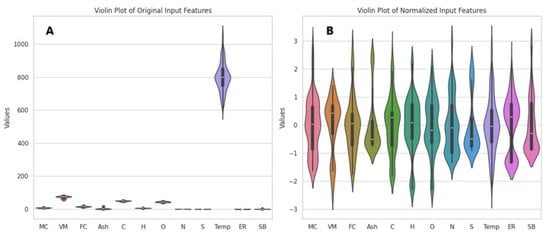 As shown in the Violin Plots (Figure 2A), significant scale differences and irregularities exist among the variables in the original dataset. In particular, the temperature variable exhibits a wide range of values (ranging from 600 to 1100). In contrast, all other variables are distributed within narrower ranges, with the highest value being 83. This results in the temperature variable suppressing the effect of the other variables, leading to pronounced heterogeneity in the dataset. Such disparities can complicate the learning process in machine learning models, as the models may overemphasize variables with larger values while disregarding the contributions of other variables. Therefore, applying preprocessing techniques such as normalization or standardization is critical to eliminating the biases caused by large-scale differences. These methods ensure all variables are brought to similar scales, contributing to more balanced and effective model performance.