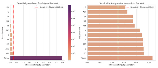 Our study emphasizes the impact of normalization on sensitivity analysis. Although the Temp variable appeared to be the most important feature in the original dataset, the Sulfur (S) variable exhibited the highest sensitivity in the normalized dataset. These results show that normalization reduces model bias, accurately reflecting the features’ relative effects. Therefore, the normalization step is crucial for enhancing model accuracy and the reliability of the analysis results.