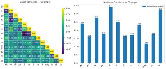 When the linear correlation matrix was examined (Figure 4), the variables most strongly related to CO output were found to be H (0.33), VM (0.32), and SB (0.30). These results indicate that these variables have a moderate positive impact on CO output. Increases in H, VM, and SB were observed to raise CO output; however, these effects were similar in magnitude, suggesting that other factors, which might provide stronger relationships, should be considered to fully explain CO output. On the other hand, the high negative correlation (−0.96) observed between carbon (C) and oxygen (O) highlights the importance of the chemical balance between these two elements. Similarly, the strong negative relationship (−0.80) between Ash and VM suggests that a reduction in volatile components during combustion leads to an increase in ash content.